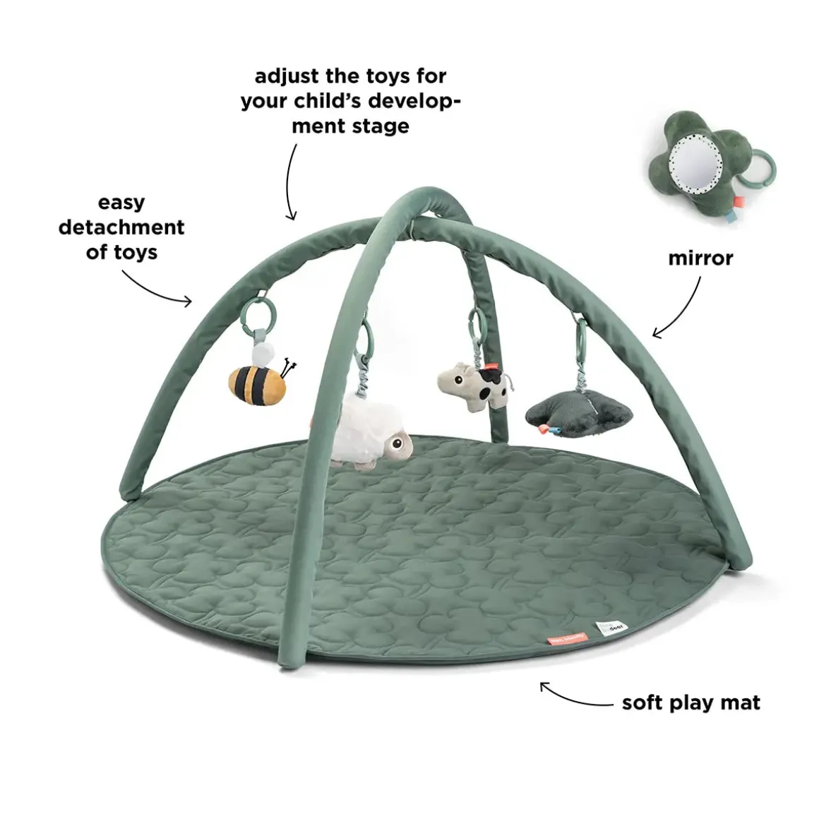 The four hanging toys can be adjusted to match your baby’s developmental stage or detached for independent play, perfect for little fingers to discover. The soft quilted mat, adorned with a cute clover pattern and thick wadding, ensures a cosy and comfortable space for playtime.
