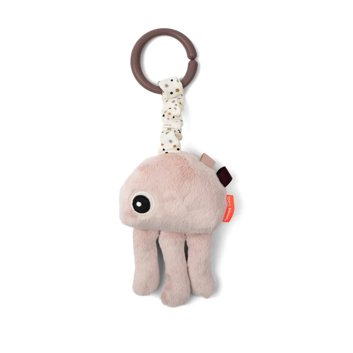 Små hænder kan nemt holde om Jelly, og legetøjsleddet gør det nemt at fastgøre Jelly til f.eks. barnevognen eller kravlegården.