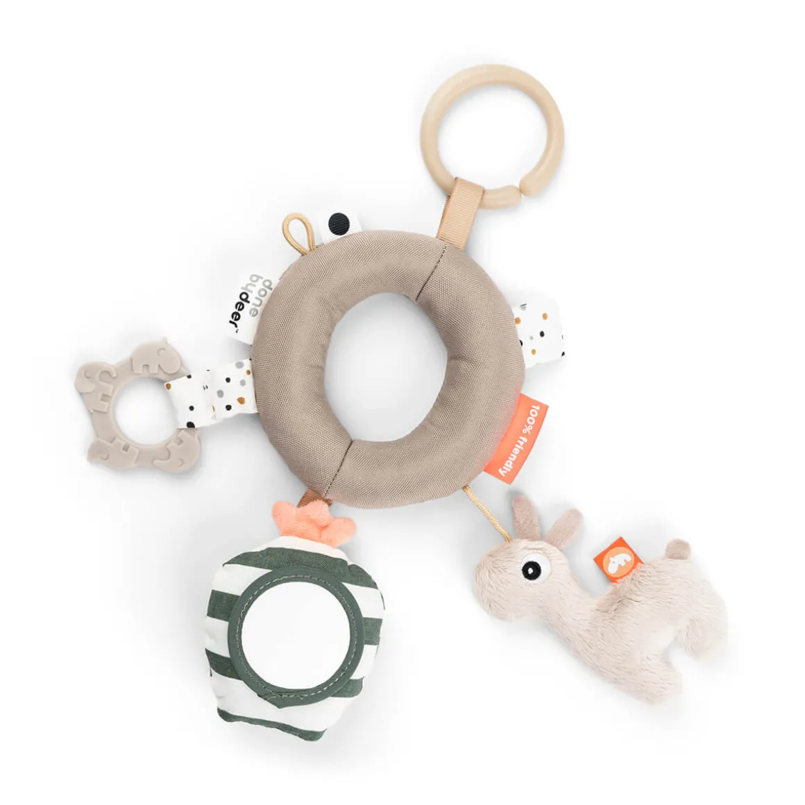 Legetøjet er let at gribe og holde om for små fingre, og den elastiske løkke kan holde en sut eller et andet stykke legetøj i nærheden.