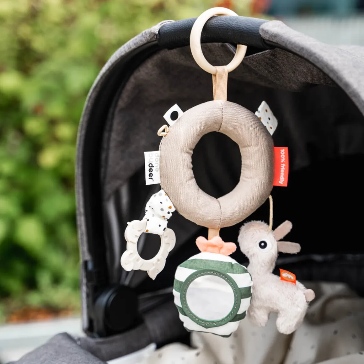 Brug legetøjslinket til at fastgøre aktivitets legetæppet til en legemåtte, klapvogn, autostol eller tremmeseng.