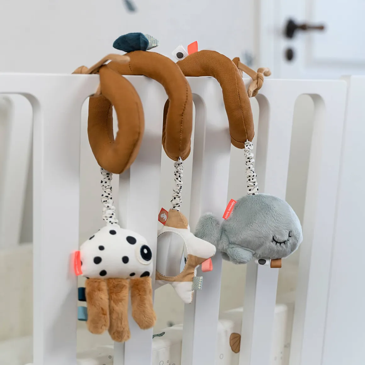 Tag Sea Friends-spiralen med i varme sennepsfarver med bløde mintblå detaljer og kontrasterende prikker og striber. Den fleksible Aktivitetsspiral kan sættes fast på tremmesengen, autostolen, barnevognen eller på siden af kravlegården.