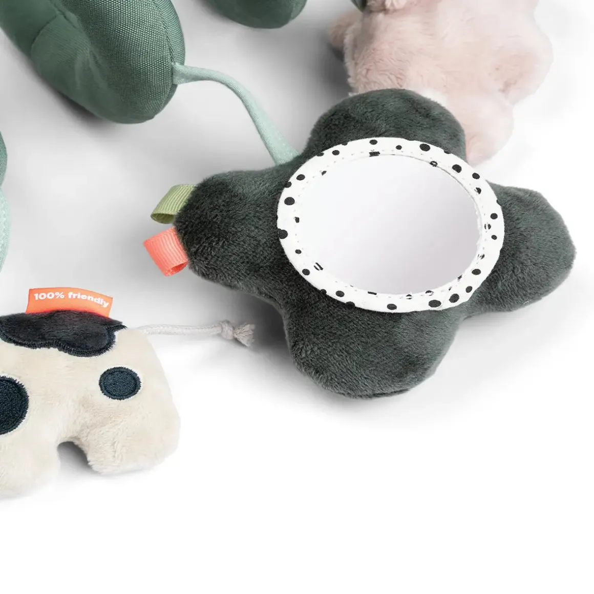 Lightweight and easy to bring along, the spiral can be fastened to a cot, car seat, stroller, or pram using the soft strings. With its cool green colour, colourful details, and playful contrasts, it offers visual stimulation while the Deer friends entertain your baby on the go.