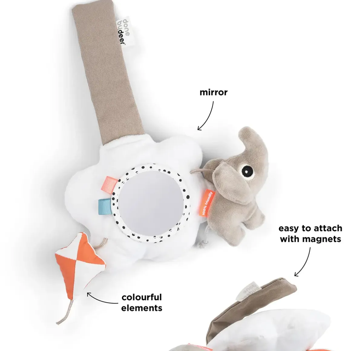 The mobile easily attaches to the pram with a magnetic attachment, making it simple to set up wherever you are. With light colours and playful contrasts, it offers visual stimulation, while Elphee adds comfort and joy as your baby explores the world around them.