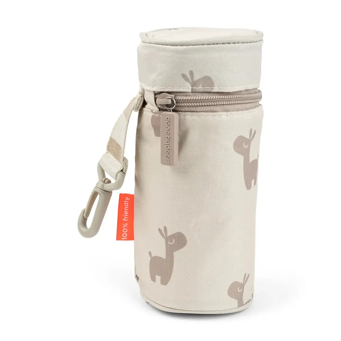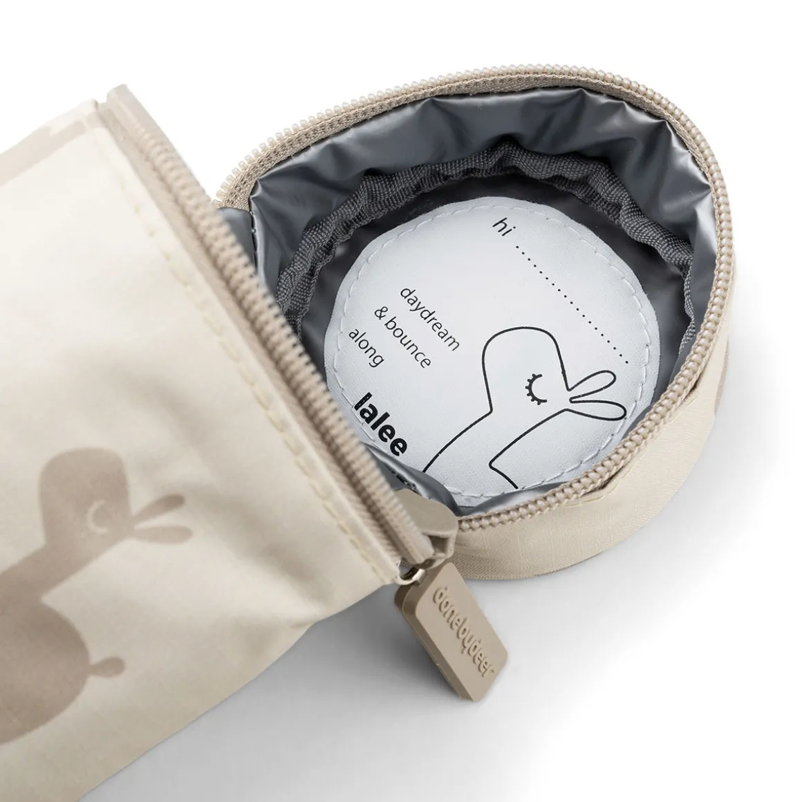 Sandposen er dekoreret med den dagdrømmende lama Lalee. Den er lavet af 100 % polyester, som er både slidstærkt og vejrbestandigt, og som er let at tørre af med en fugtig klud. Remmen har Done by Deers signaturstriber – også i en flot sandfarve.