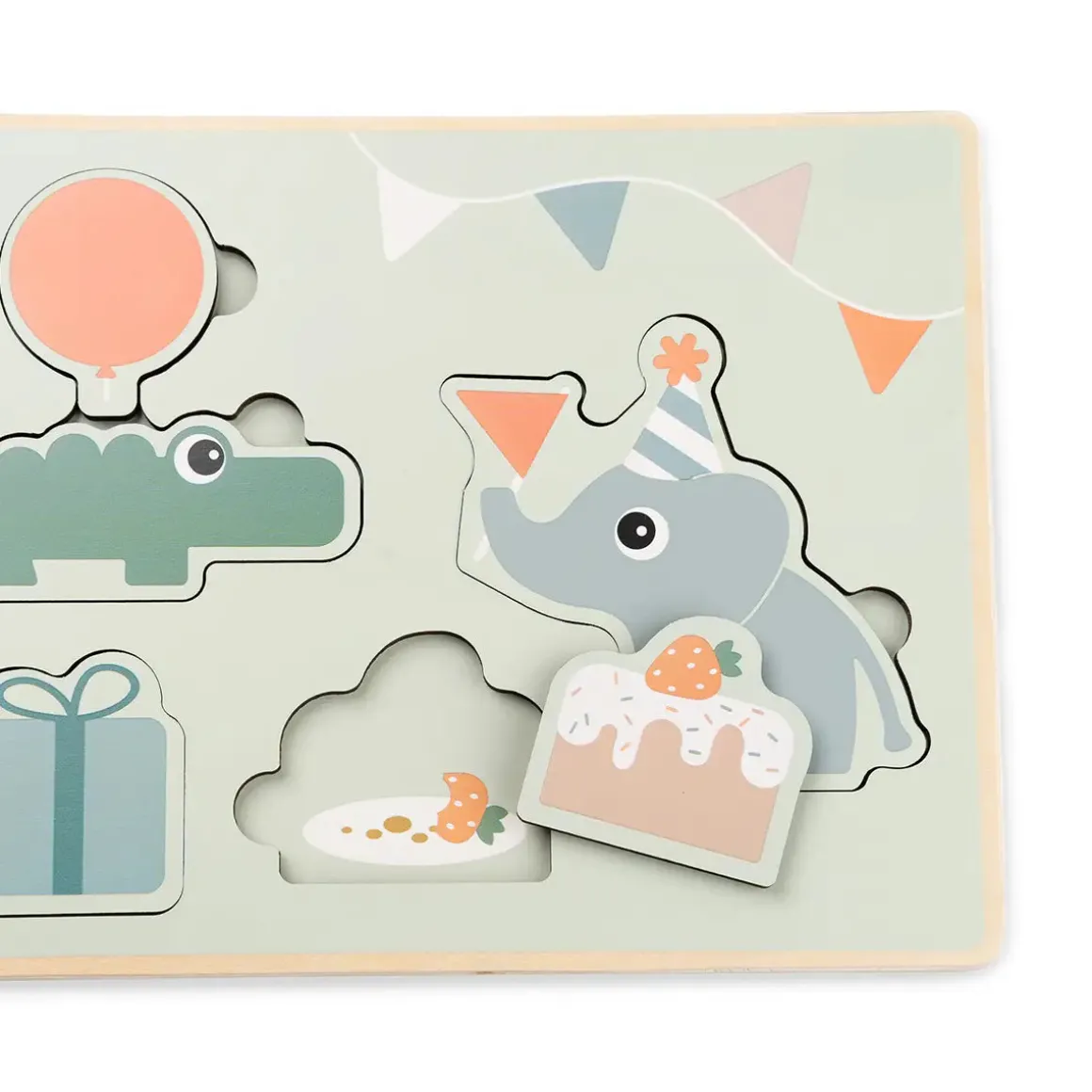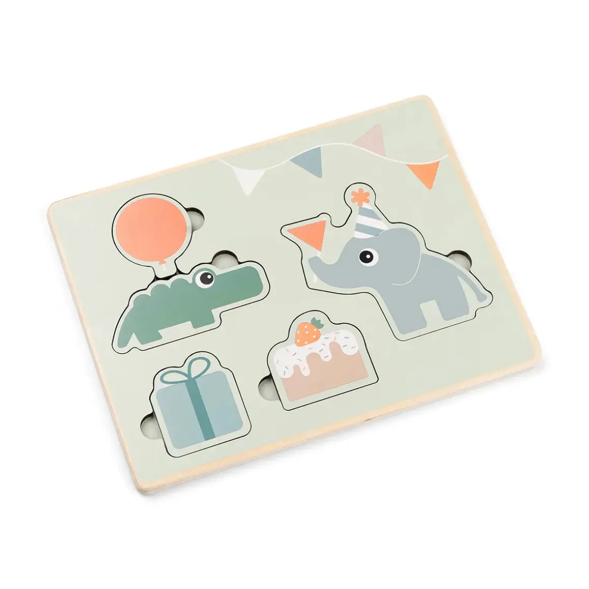 Dette søde puslespil i træ er specielt lavet til små hænder, hvilket gør det ideelt til tidlig læring og leg. Hvert lag afslører en ny overraskelse: fra en skjult gave til andre legende genstande, der venter på at blive opdaget.