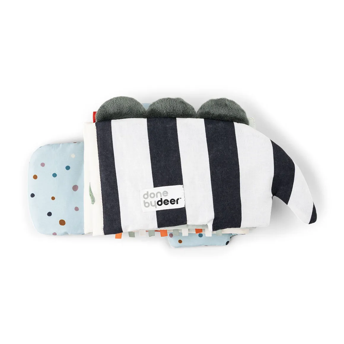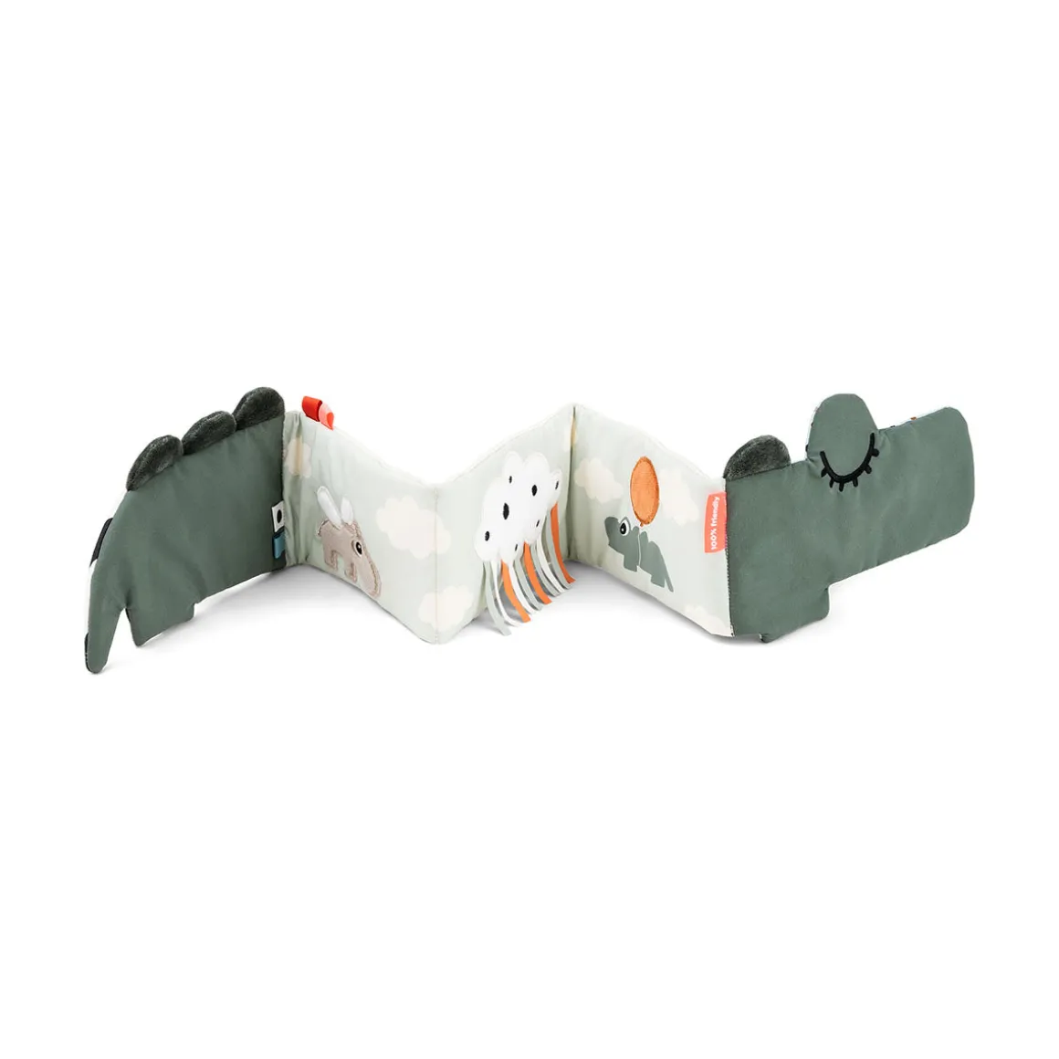 Folde-ud stofbogen er fyldt med glade farver og elementer. Den grønne krokodille gemmer på spændende overraskelser som legende prikker i forskellige farver og kontrasterende striber i sort/hvid.