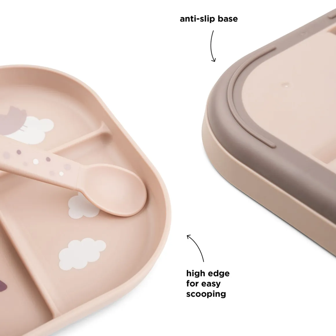 Rumtallerkenen i pudder er trykt med et legesygt Happy Clouds motiv. Croco og Birdee udforsker verden blandt skyerne og inviterer dit barn til at opleve nye smage og konsistenser. Basens mørkere pudder giver en tofarvet detalje.