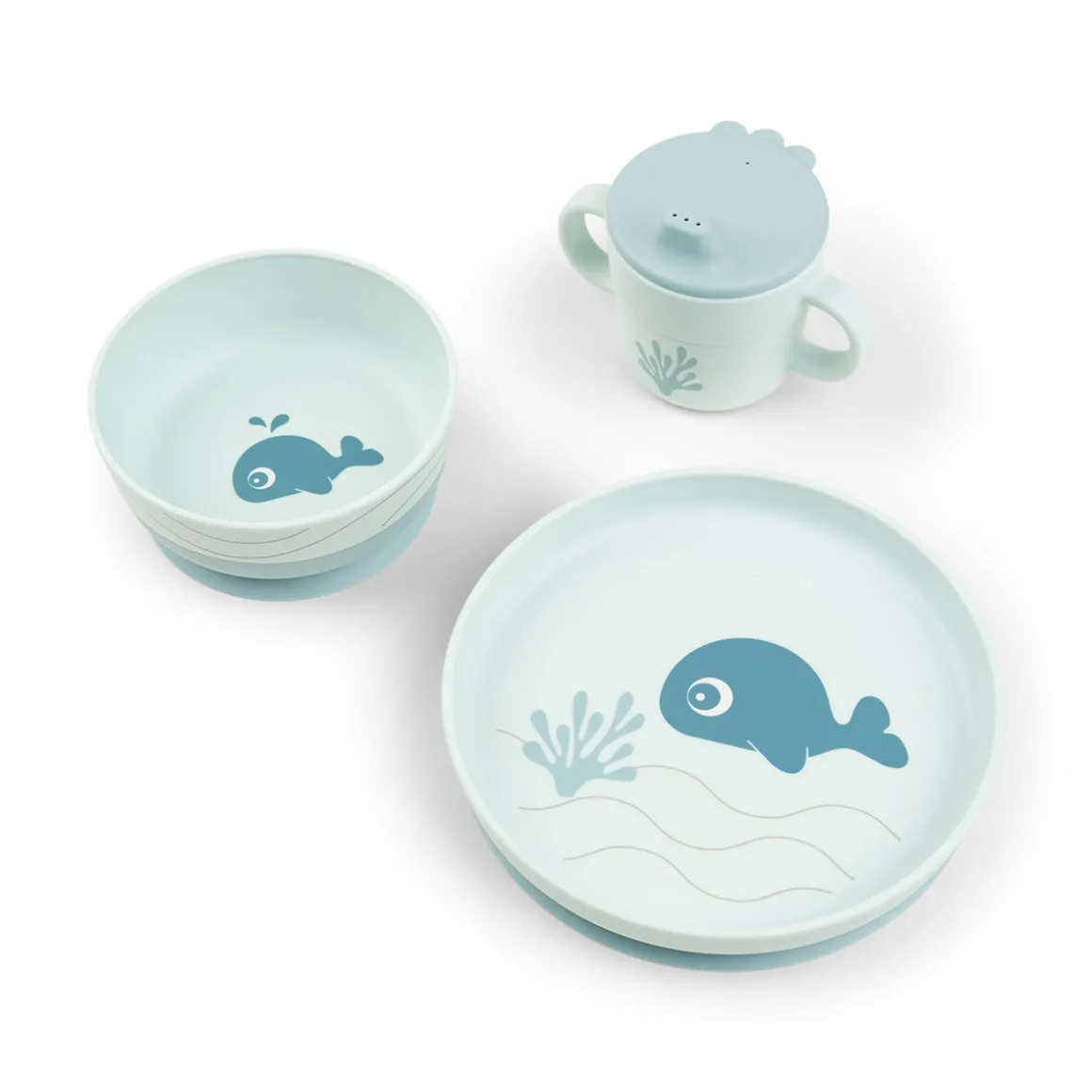 Det blå spisesæt har et sødt motiv af Wally på undervandsekspedition. Koppen med 2 hanke og tud er dekoreret med muslingeskaller og søstjerner. Den mørkeblå giver en fin tofarvet detalje, og skålen har seje bølger. Lad dit barn dykke ned i det.