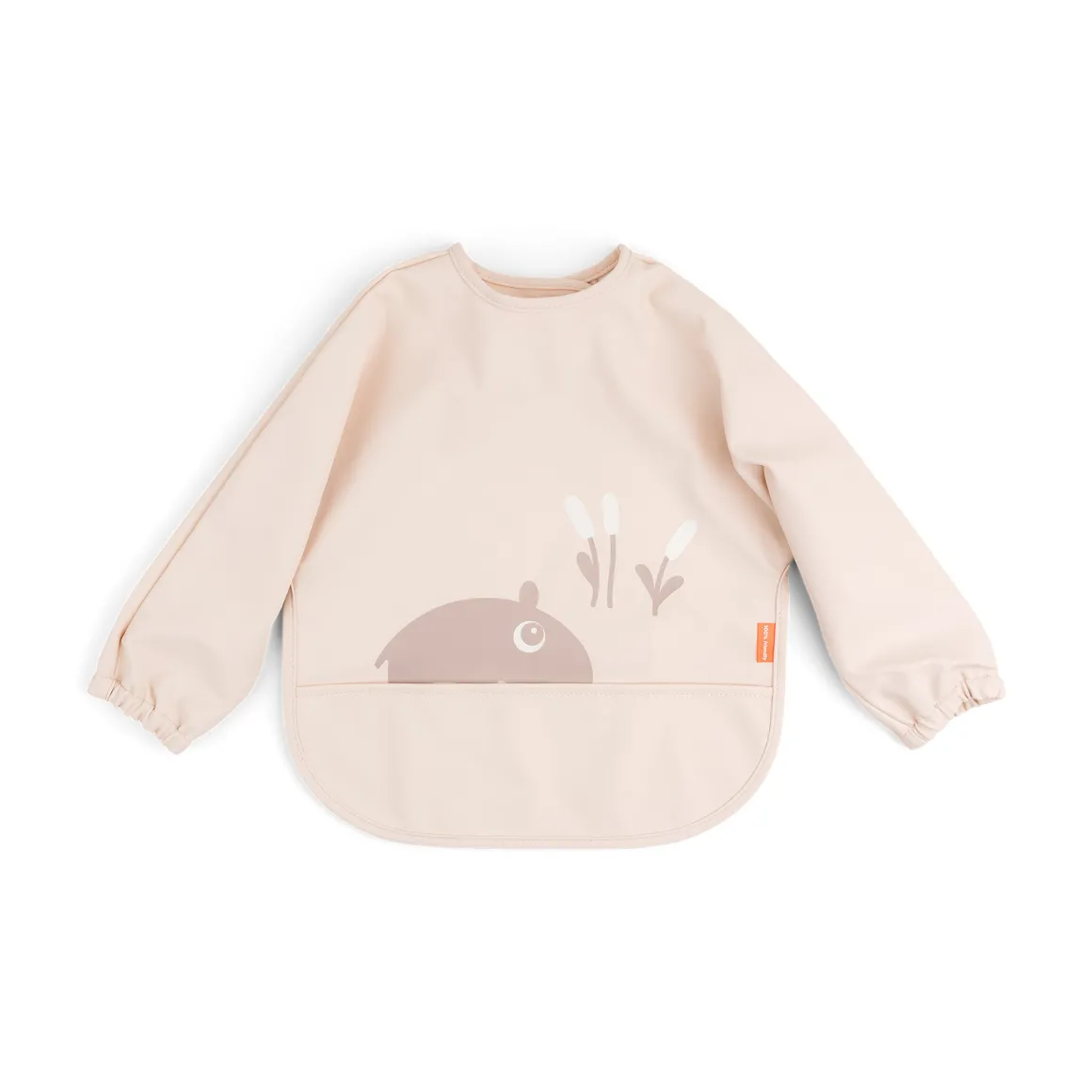 Den bløde hagesmæk med den søde flodhest er vandtæt med praktiske elastikærmer, som holder barnets krop tør. Hagesmækken er nem at tørre af, hvilket sparer dig for en masse rengøringstid! Den søde hagesmæk er dekoreret med Deer friend Ozzo og dekorative vandplanter.
