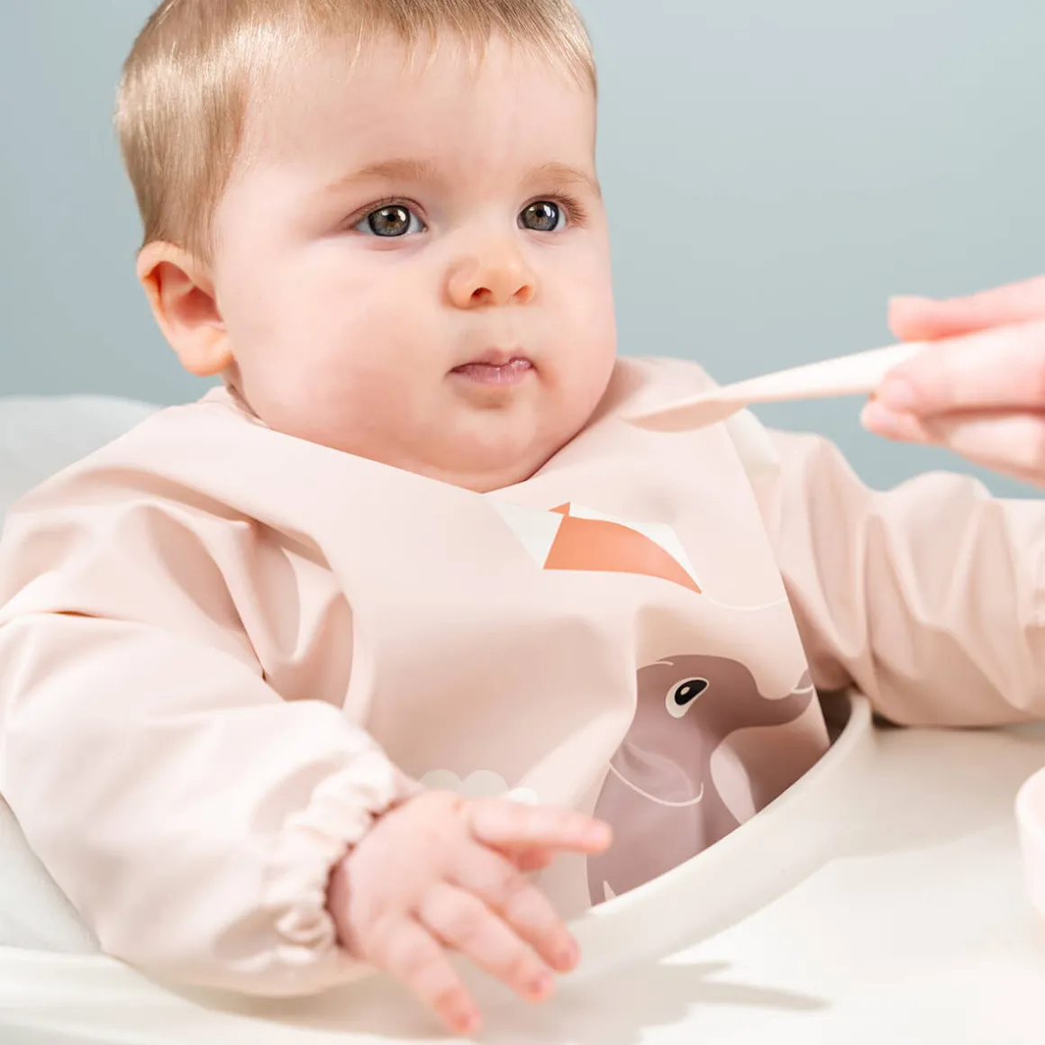Denne søde, pudderfarvede hagesmæk har et sødt motiv af Elphee, der flyver med en drage. Hagesmækken sikrer renlighed med sin vandtætte overflade, der beskytter tøjet mod spild og snavs. Tilføjelsen af beskyttende ærmer giver ekstra dækning og holder dit barns tøj sikkert.