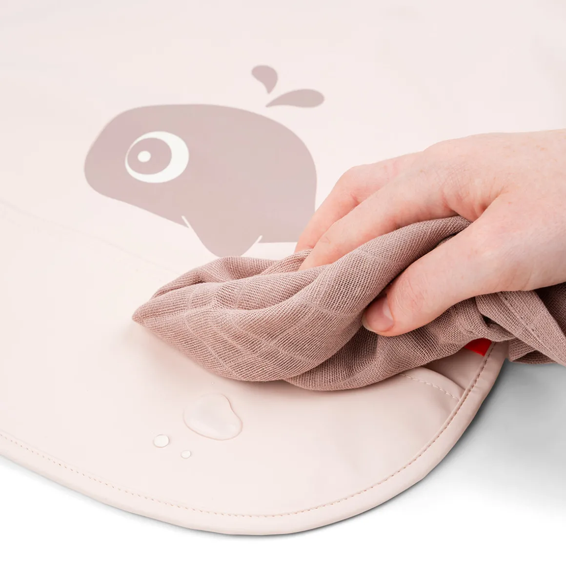Den bløde hagesmæk er vandtæt og har praktiske elastiske ærmer, der holder den lille tør. Den er nem at tørre af og sparer dig for en masse rengøringstid.