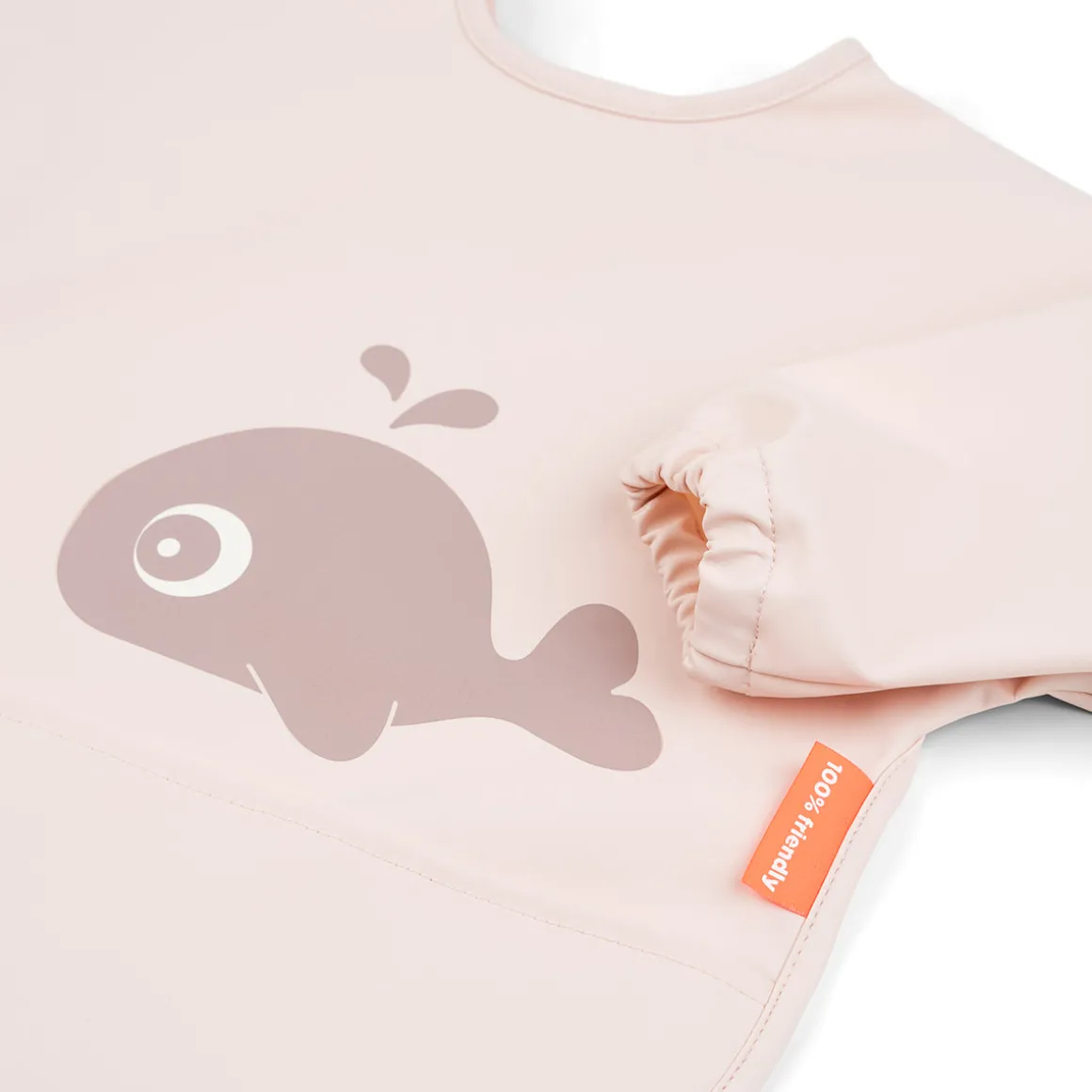 Hagesmækken m/ærmer og lomme er i en sød pudderfarve med et motiv, der viser Wally, den mægtige hval, der sprøjter med vand.