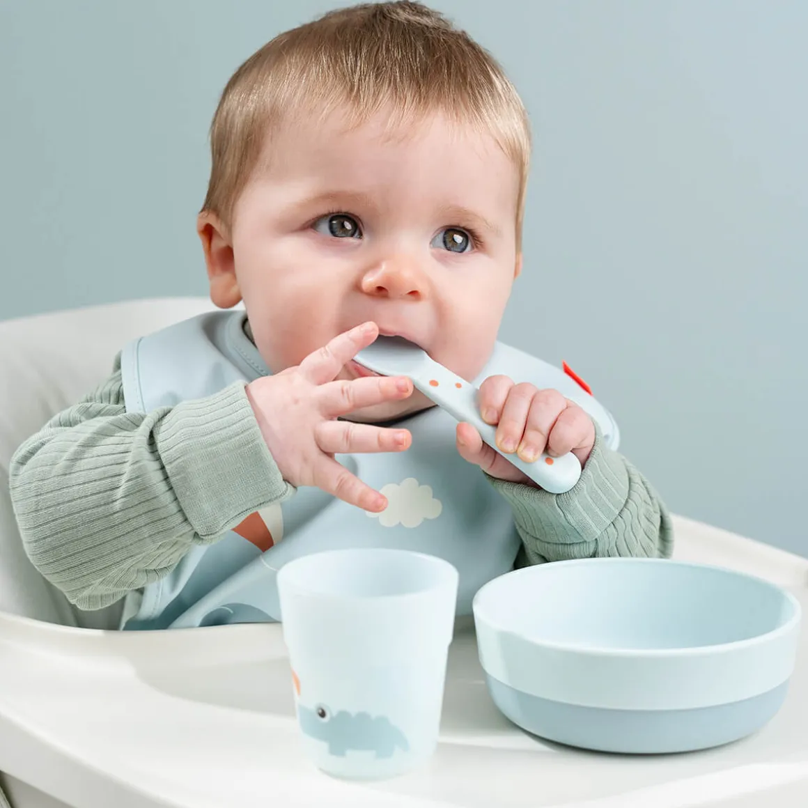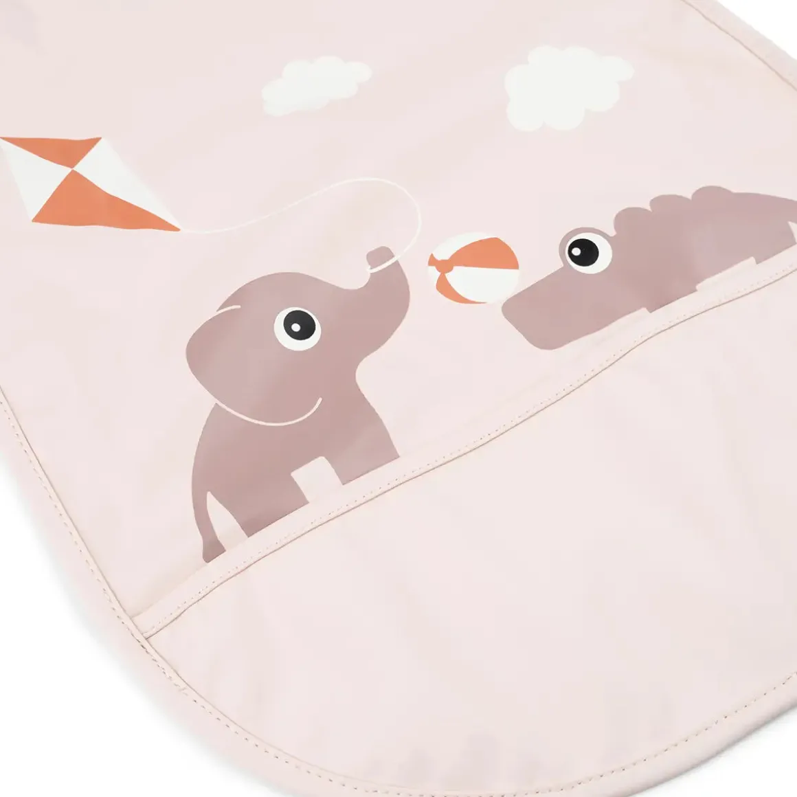 Denne praktiske hagesmæk med velcro i en sød pudderfarve er designet til at gøre måltiderne sjove for dig og dit barn. Med et legende motiv af Elphee og Croco, der nyder Playground, tilføjer hagesmækken et strejf af legesyge til hvert måltid.