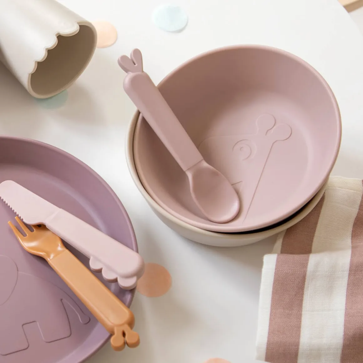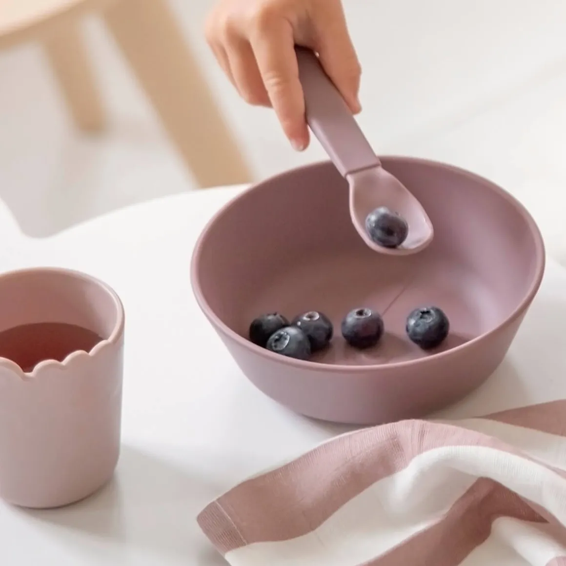 En praktisk 4 stk Kiddish skeer i to nuancer af pudder. Skeerne har en eksklusiv, mat og silkeagtig overflade, som føles rar for barnet.