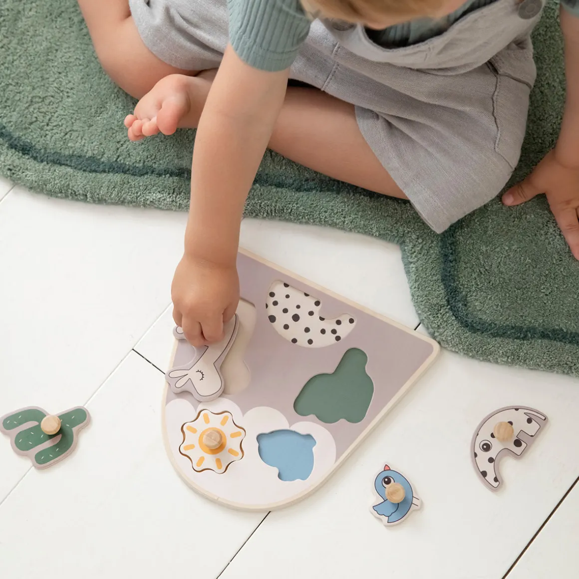 Små fingre kan gribe om de grove brikker og hjælpe Lalee, Birdee og Antee tilbage på plads og solen på toppen af bjerget. Åh, kaktussen mangler! Den skal placeres ved foden af bjerget – nu er alle brikkerne på deres rette plads.