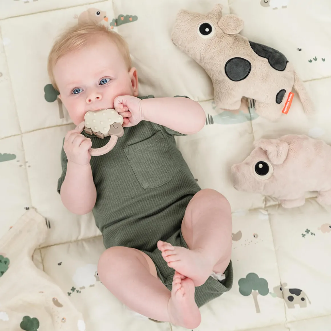 • Dotti i fin sandfarve med kontrastfarver for visuel stimulering