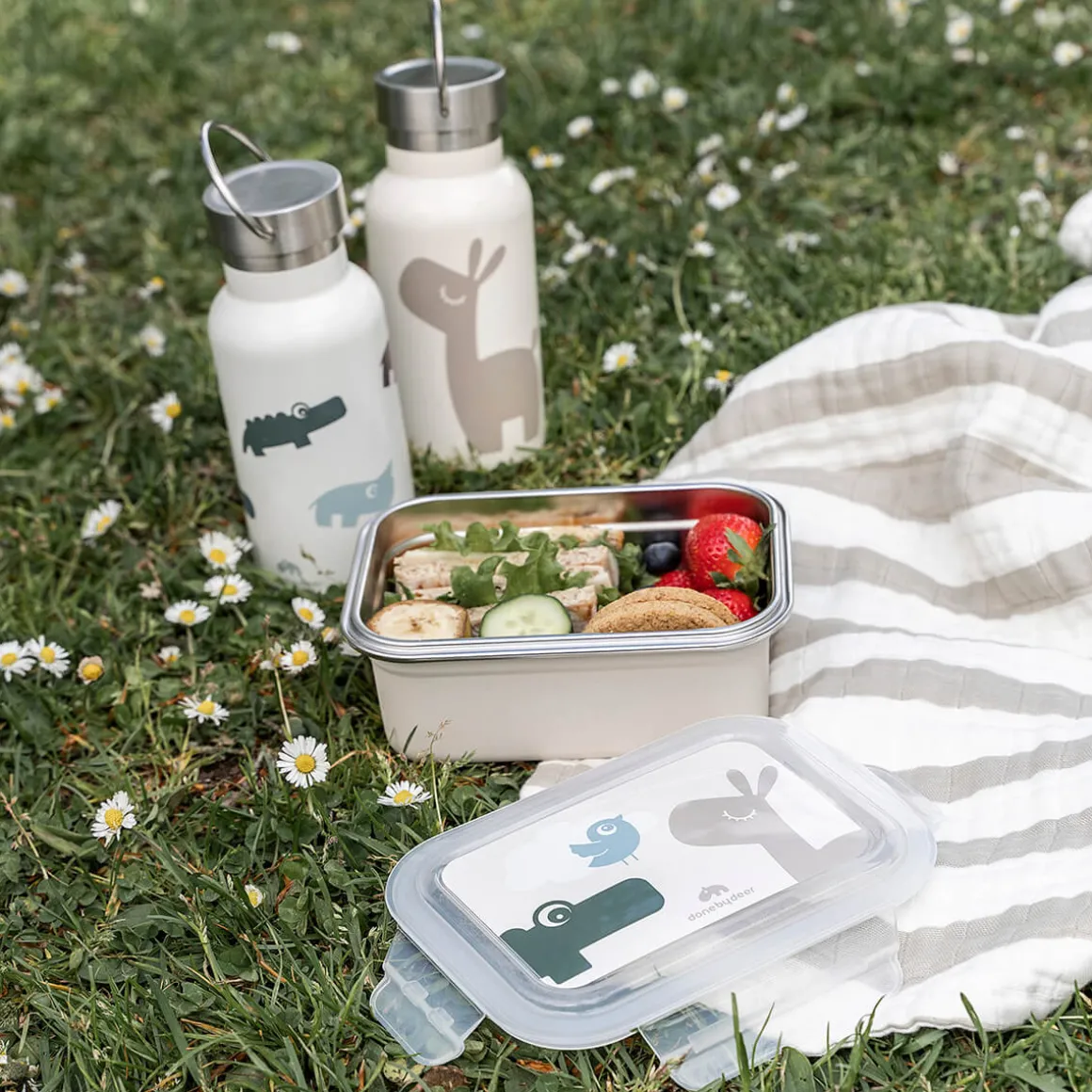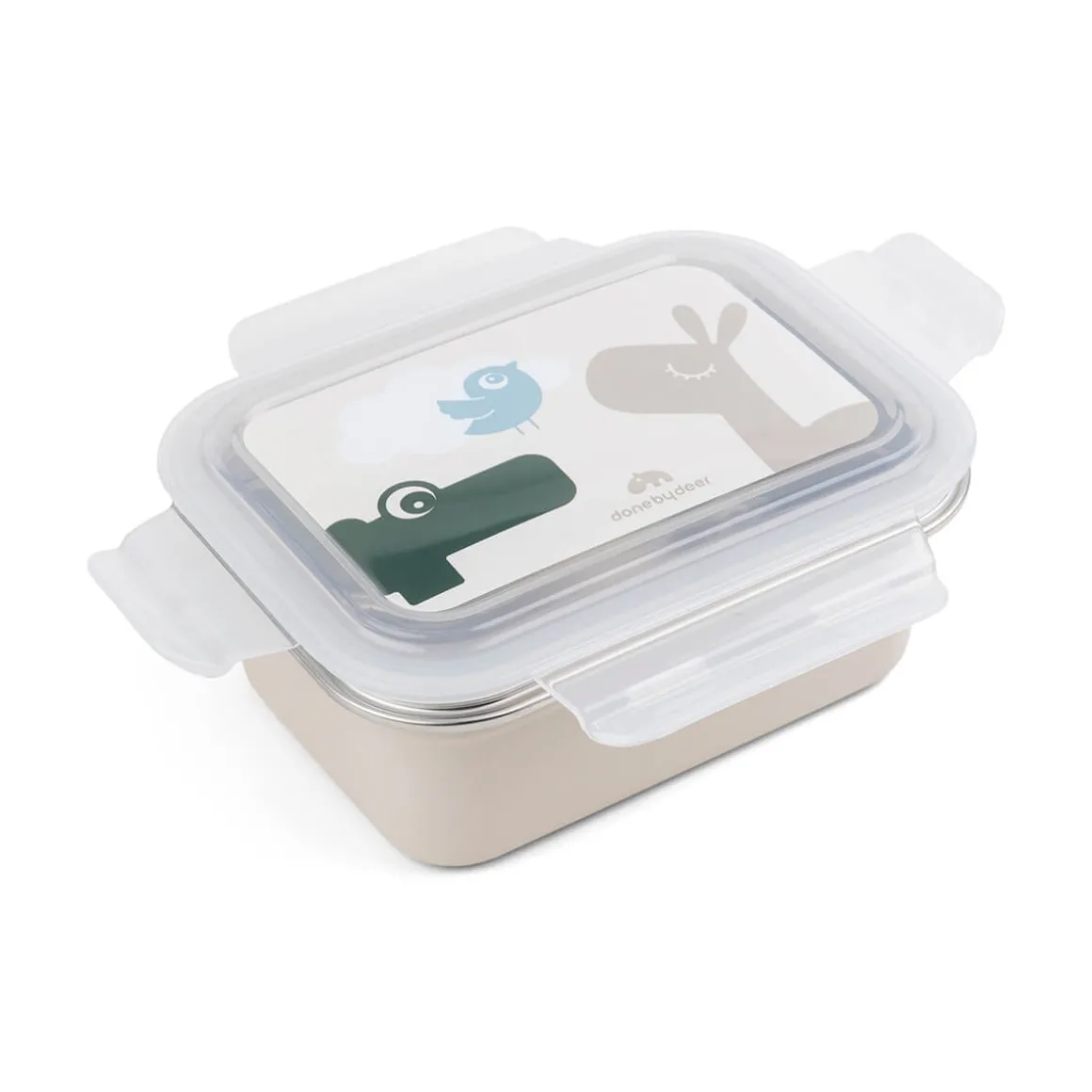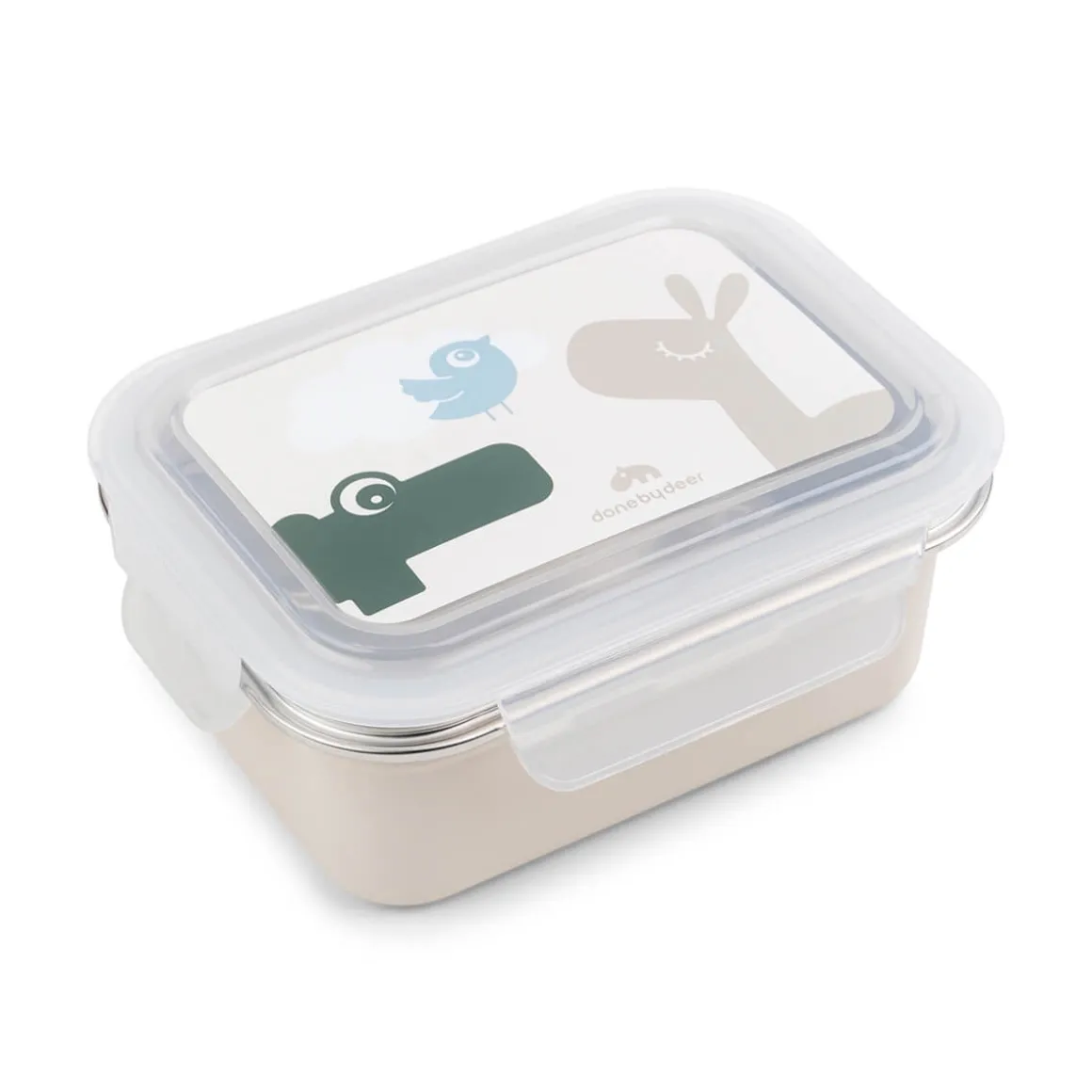 Den praktiske madkasse i rustfrit stål er i en sandfarvet beige tone. Låget er dekoreret med Deer friends Croco, Lalee og Birdee i bløde nuancer af grøn, sand og blå.