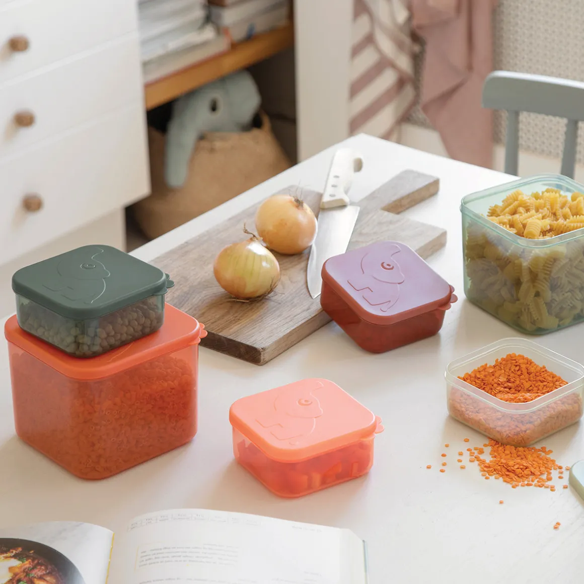 Pak familiens favoritter i disse seje, gennemsigtige beholdere til madopbevaring i grønne nuancer. Lågene har søde Croco-klumper for nem åbning, og de er præget med motiver af Elphee.