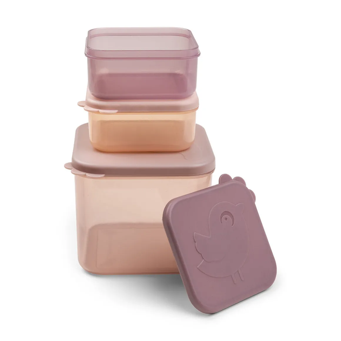 Brug disse praktiske beholdere til madopbevaring til at holde orden i køkkenskuffen eller tag dem med som en god ledsager til frokosten. Det søde sæt består af tre beholdere i to forskellige størrelser. Perfekt til at gemme og medbringe favoritter.