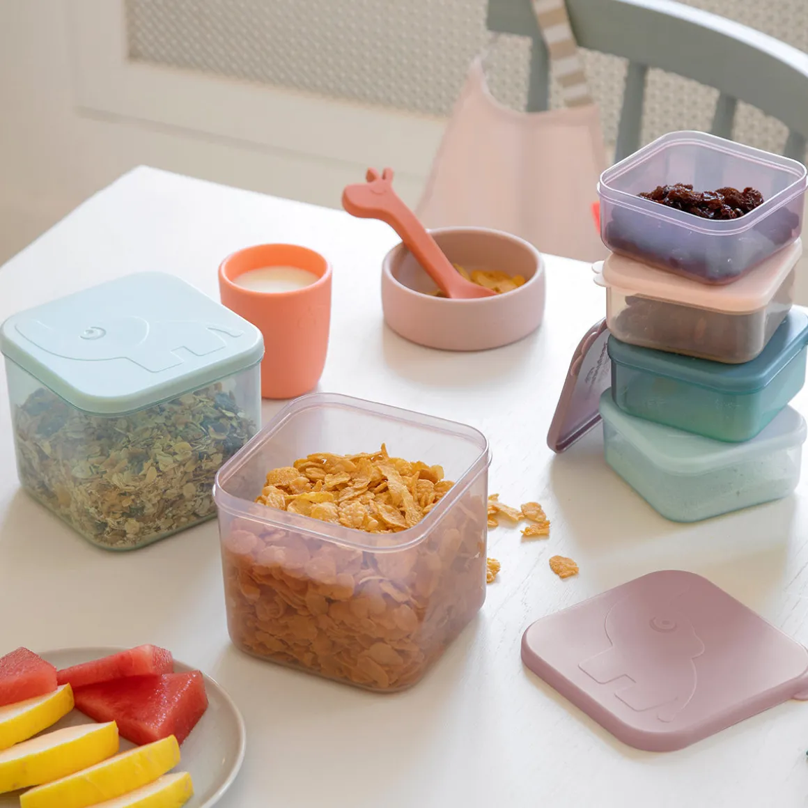 Pak familiens favoritter i disse seje, gennemsigtige beholdere til madopbevaring i pudderfarver. Lågene har søde Croco-klodser for nem åbning, og de er præget med motiver af Elphee og Birdee.