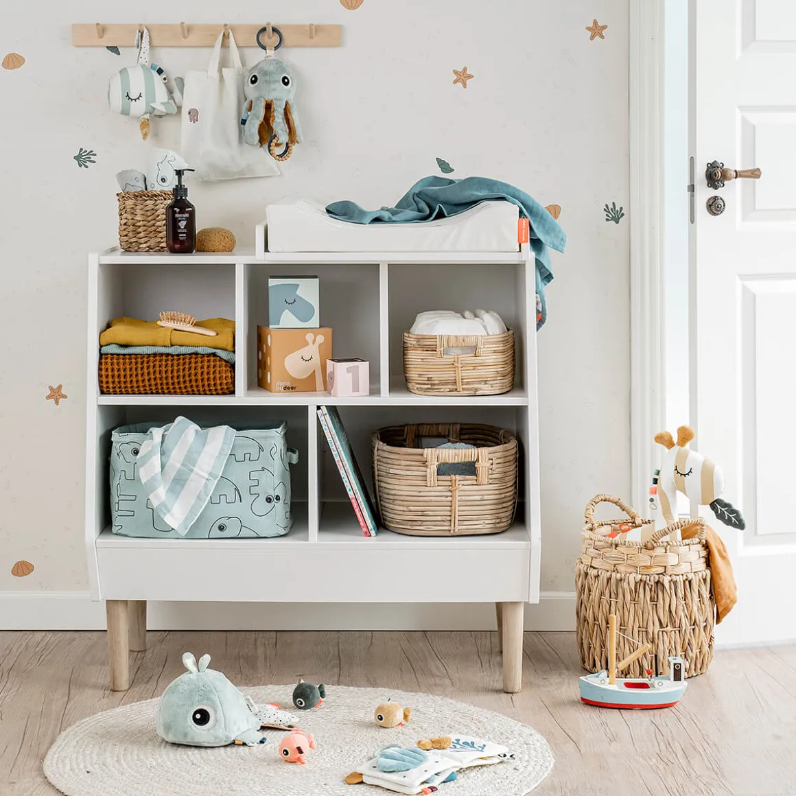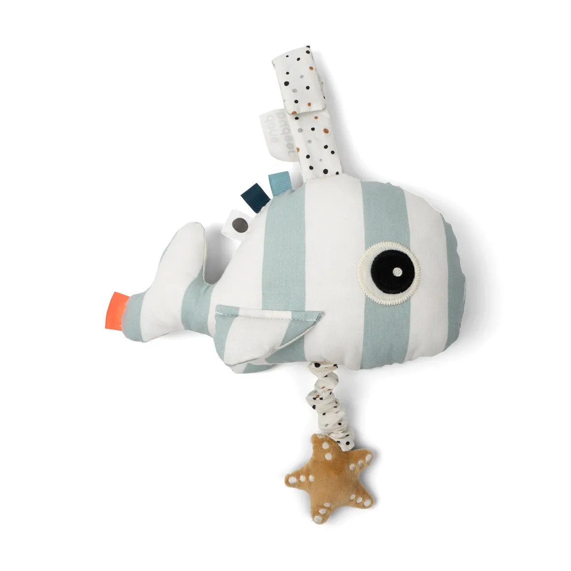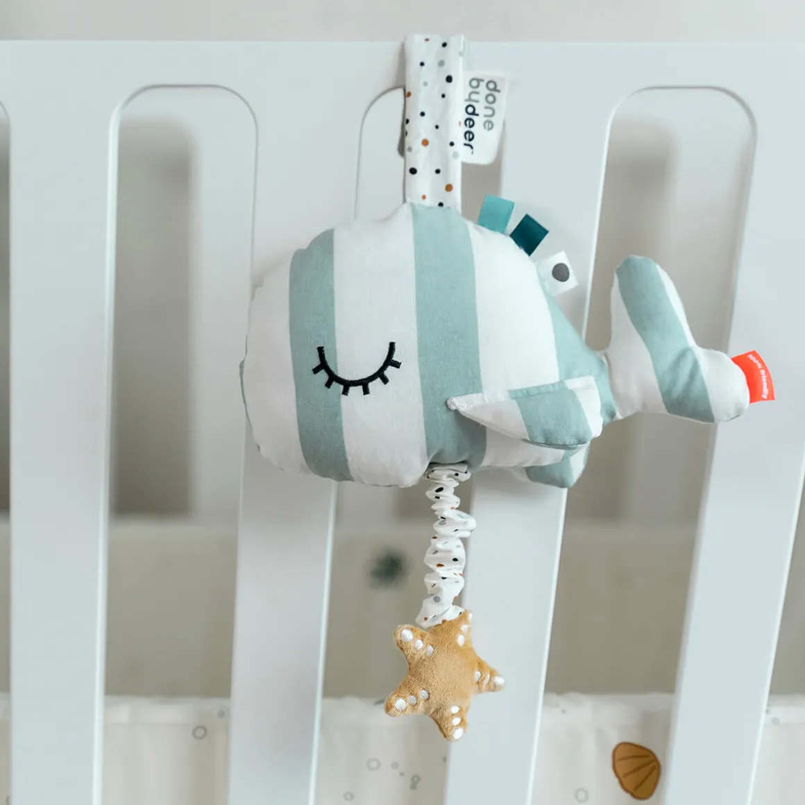 Den søvnige hval med bløde blå striber har søde detaljer som kontrastfarvede prikker og en blød søstjerne. Den vil berolige dit barn, når det er tid til at slappe af eller tage af sted til drømmeland.