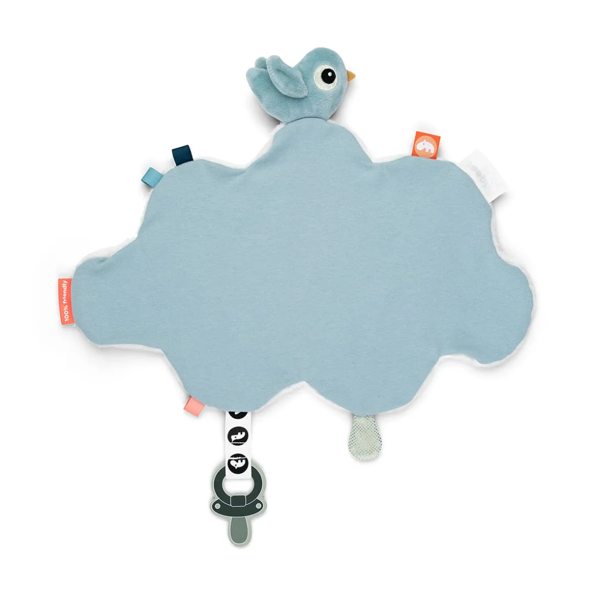 Dette hyggelige nusseklud er formet som en sky og har legesyge prikker. En sød blå Birdee vil holde dine børn med selskab, mens de kæler.
