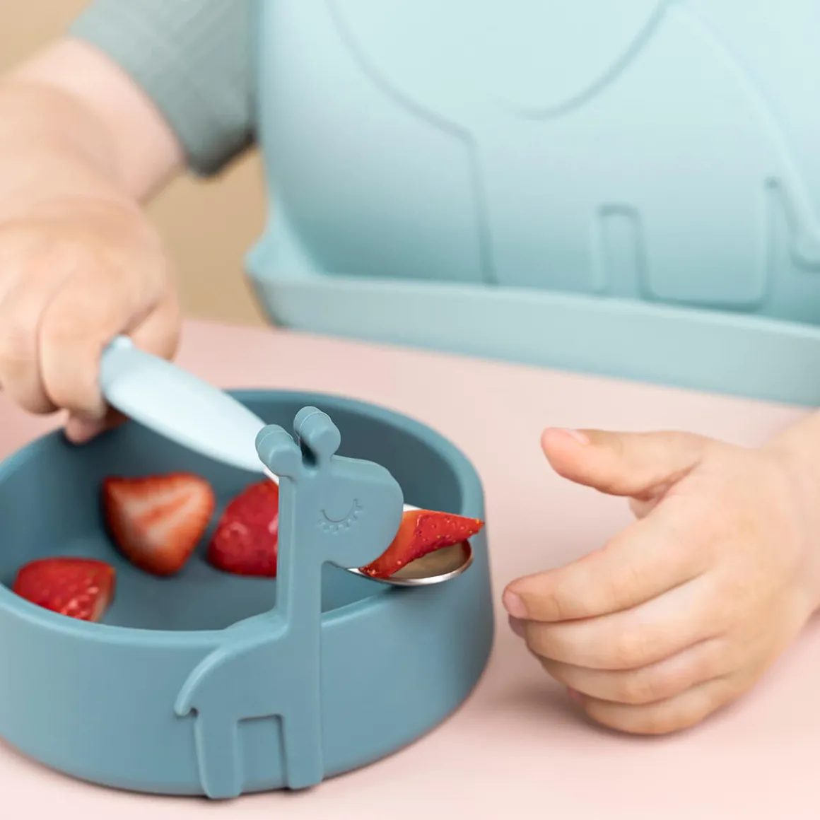 Børnene vil nyde at have de sjove dyr med til måltiderne – lad Elphees lomme fange den mad, der glipper, og lad Raffi opmuntre dem til at nå den spændende milepæl, det er at spise selv. Det søde gavesæt er i bløde toner af blå.