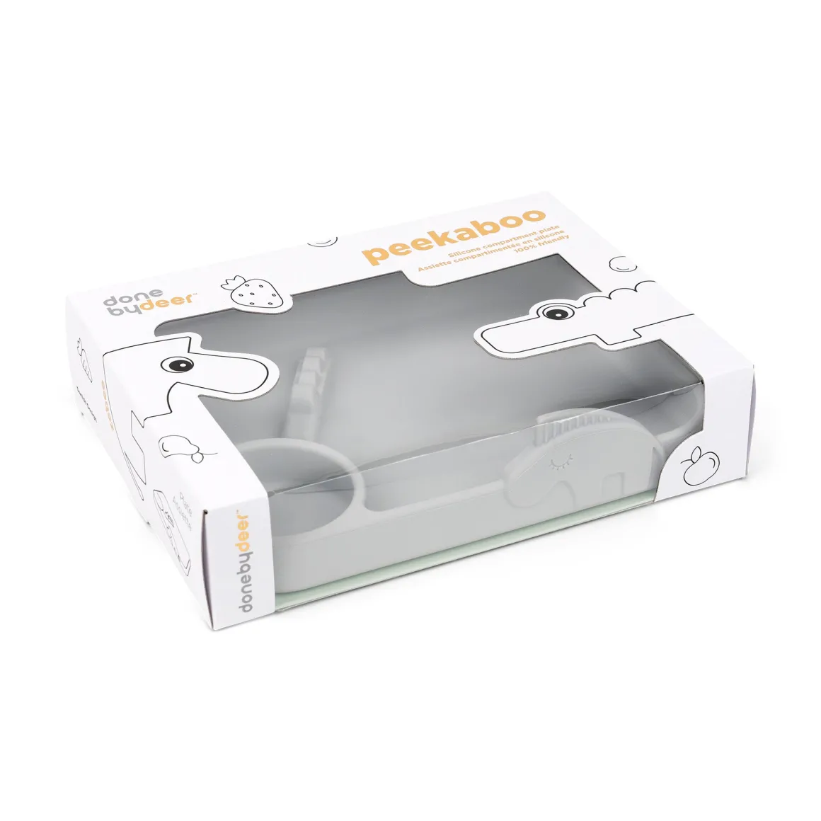 Børnene vil nyde at have de sjove dyr med til måltiderne – lad Zebee vogte maden og Croco tage en svømmetur. Den grå tallerken matcher de øvrige dele af Peekaboo-serien og er pakket i en flot dekoreret gaveæske.