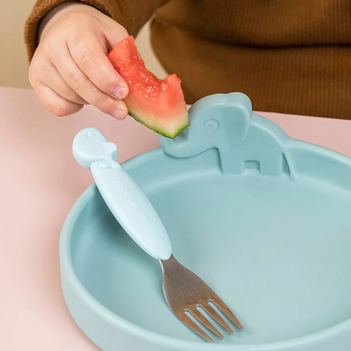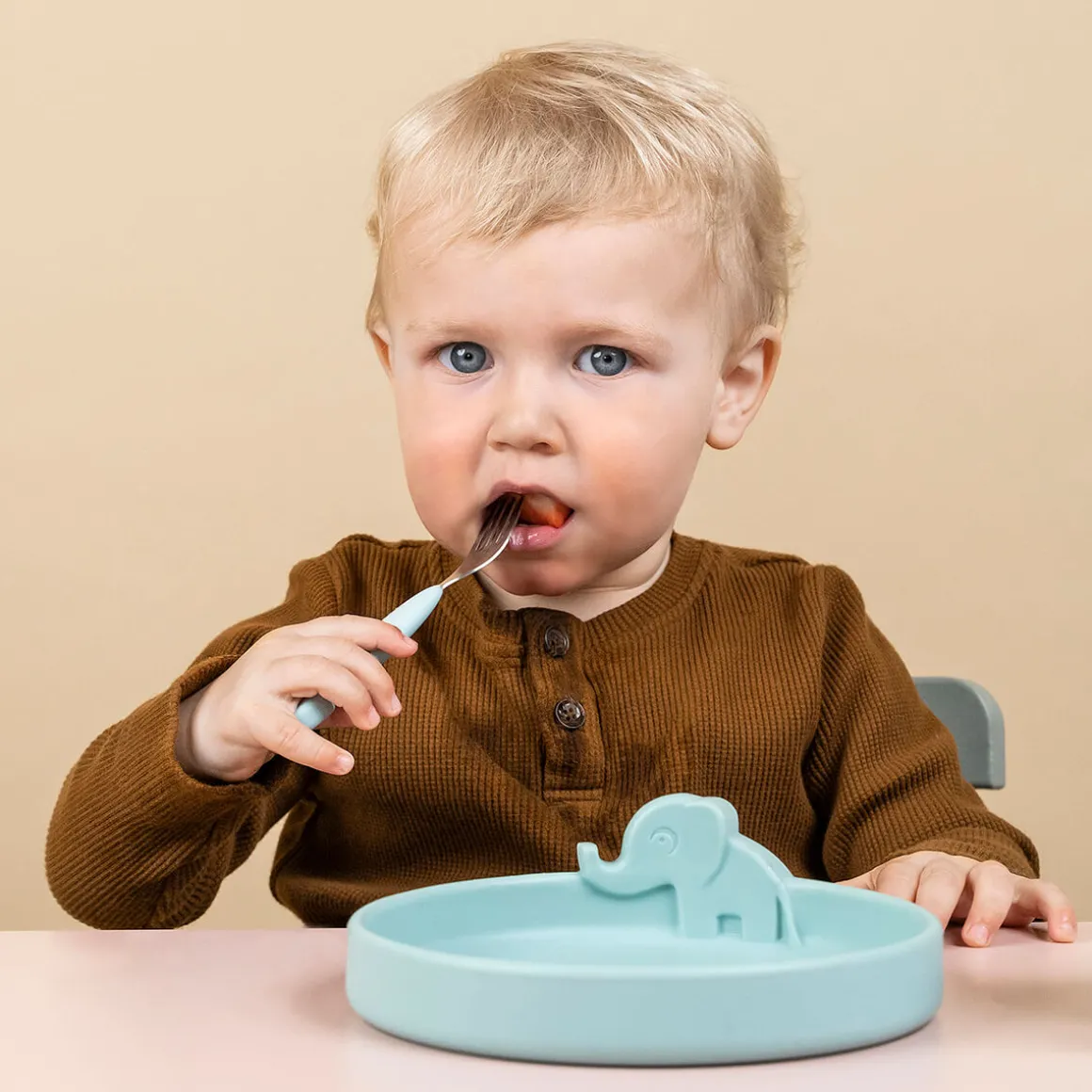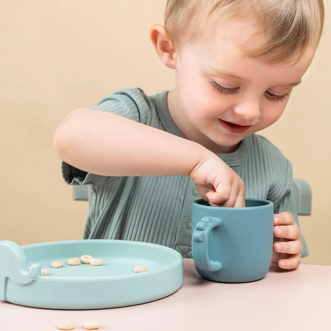Børnene vil nyde at have de søde dyr med til måltiderne – opdag Croco i bunden af deres kop, når de drikker, og lad Elphee og Wally hjælpe dem med at nå den spændende milepæl, det er at spise selv. Sættet er i bløde toner af blå.