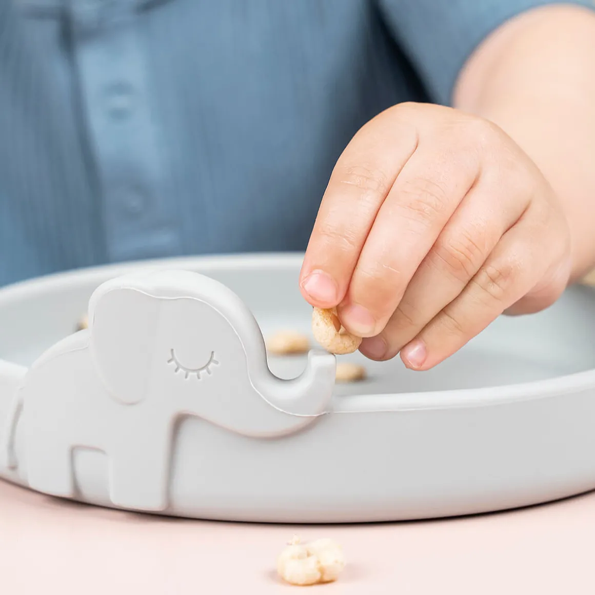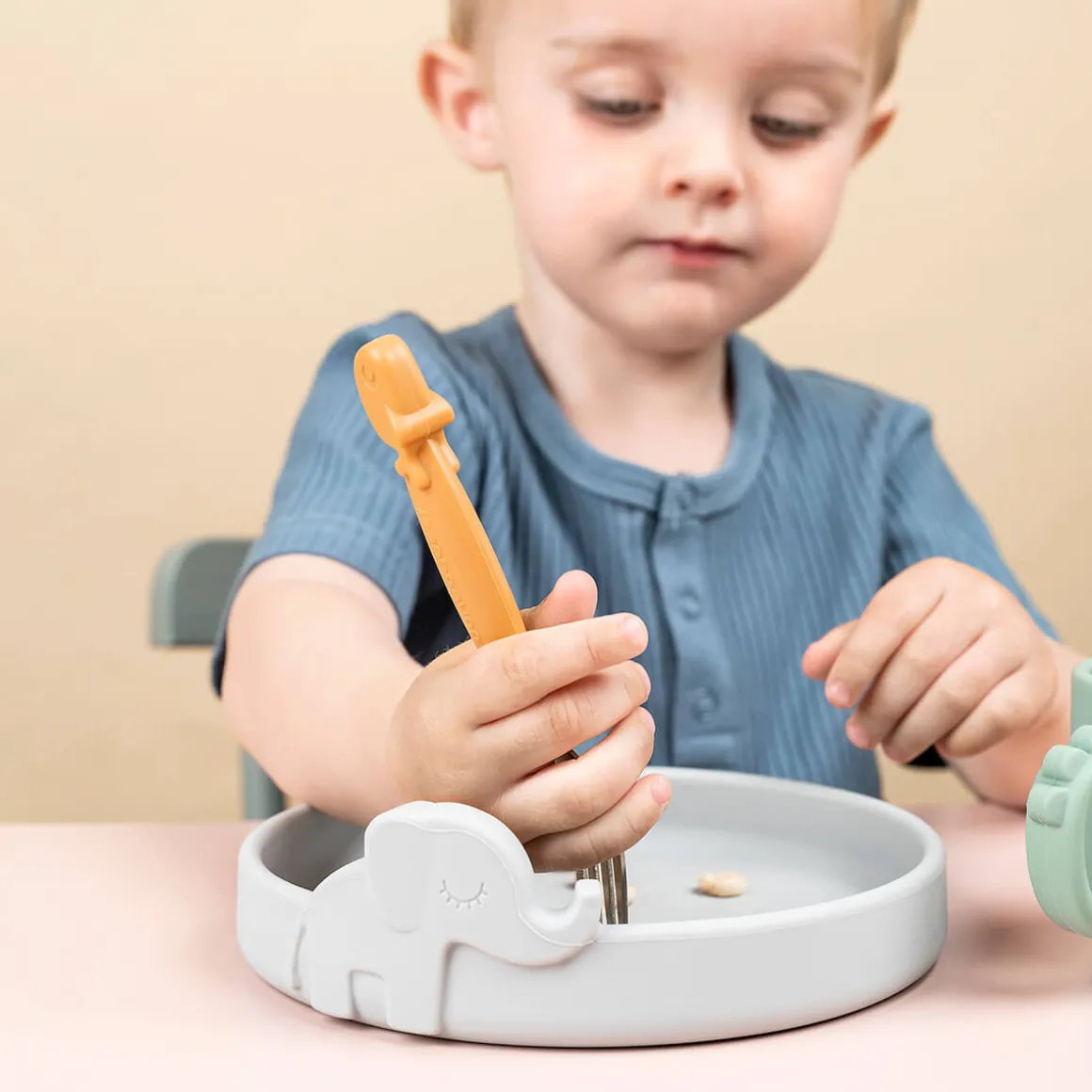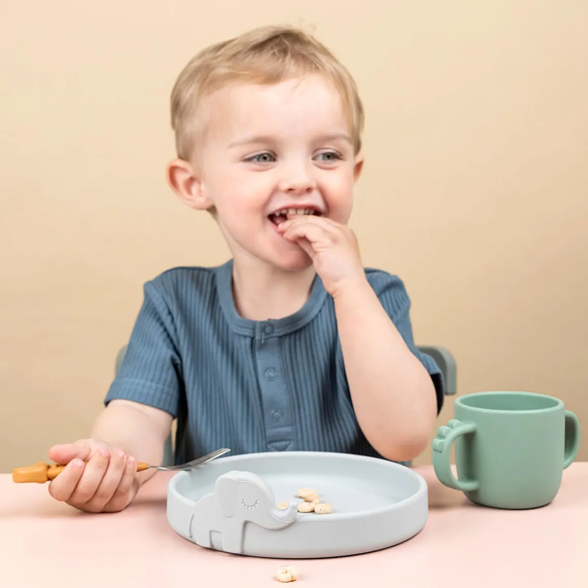 Børnene vil nyde at have dyrene med til måltiderne – opdag Croco i bunden af deres kop, når de drikker, og lad Elphee og Wally hjælpe dem med at nå den spændende milepæl, det er at spise selv. I en blanding af grå, grøn og sennep.