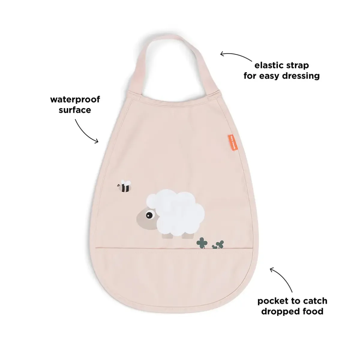 The elastic strap ensures easy dressing, while the pocket at the bottom catches any dropped food, keeping your little one clean and comfy. With a lovely powder colour and an engaging Sheepy motif, this bib brings a touch of fun to every meal.