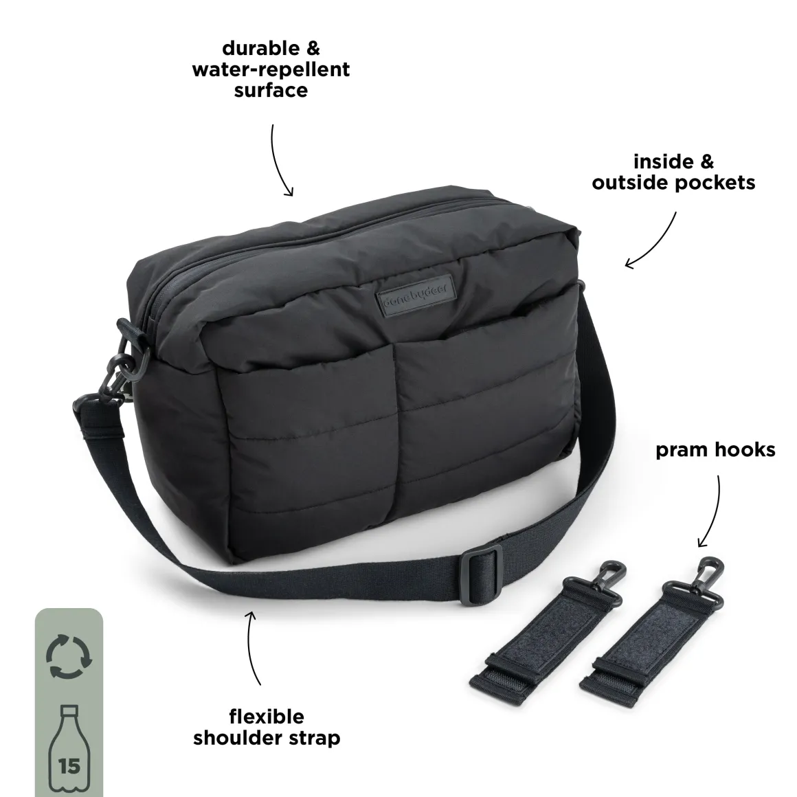 • A flexible shoulder strap and pram hooks are included