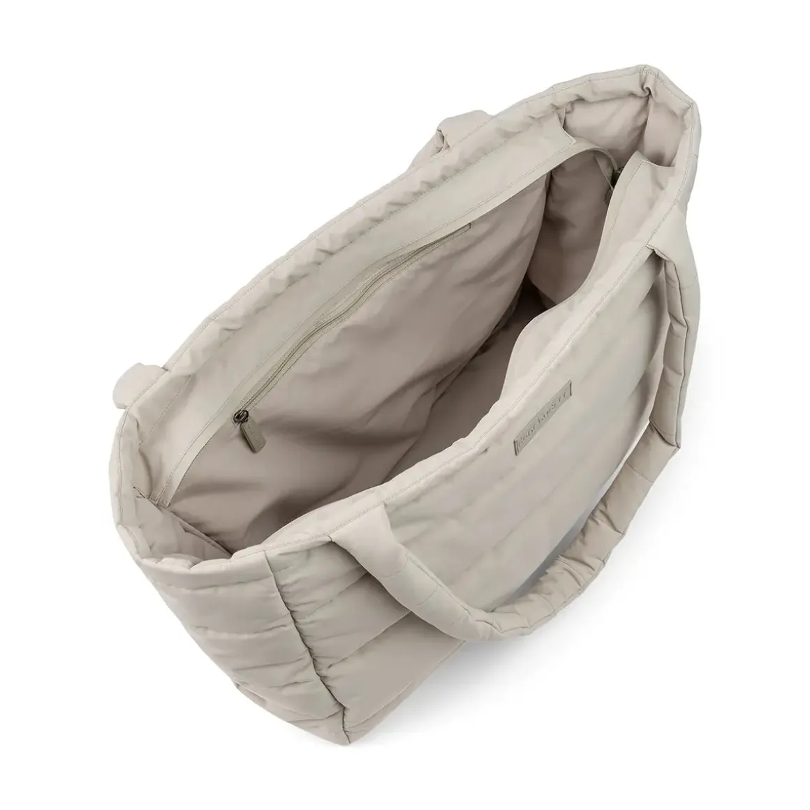 Denne bløde sandfarvede quiltede tote bag er perfekt til alle de ekstra ting, du og dit barn har brug for på farten. Med en sikker lynlåslukning forbliver dine ejendele i sikkerhed, mens den slidstærke, vandafvisende overflade sikrer, at den kan klare de daglige eventyr.