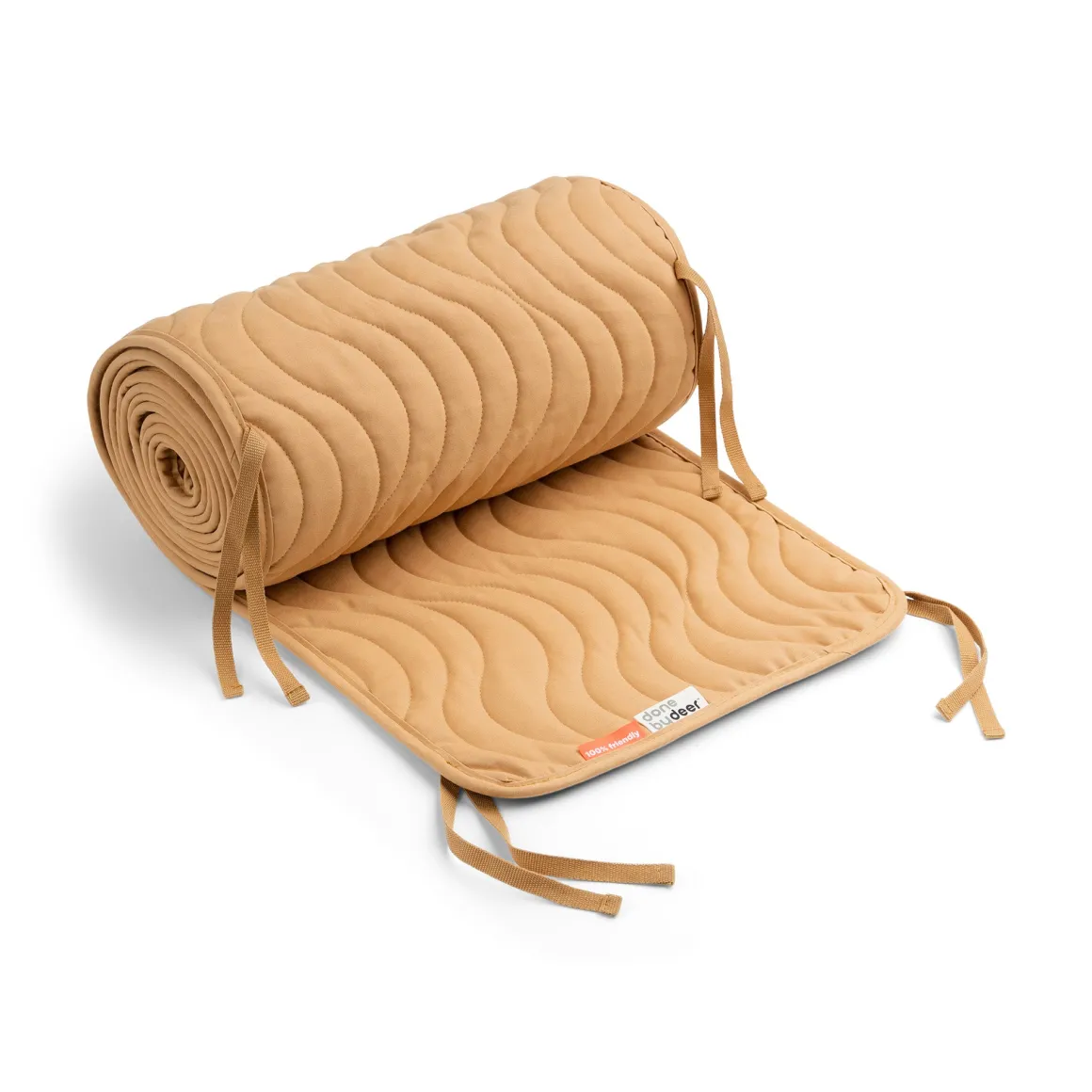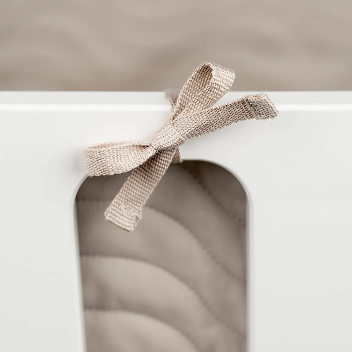 Den bløde sengerand har praktiske snore til at fastgøre den til babysengen. Den måler 360 cm, hvilket gør den velegnet til de fleste tremmesenge.