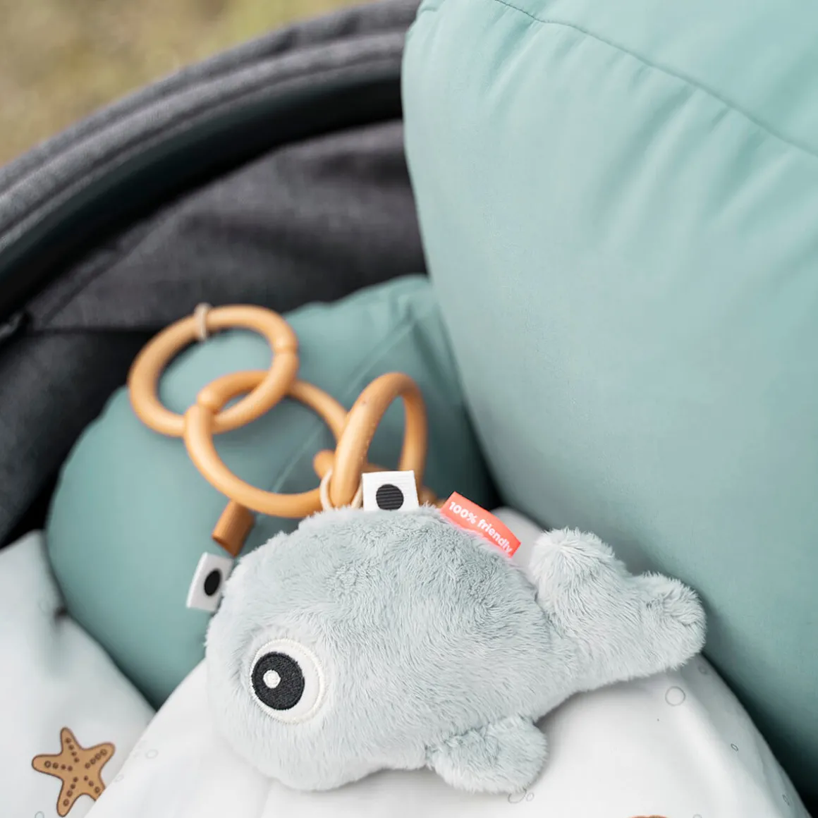 Med den elastiske løkke er det nemt at fastgøre den lille sanselegetæppe til en legemåtte, klapvogn, autostol eller aktivitetscenter ved hjælp af en Ophængsring. Den superbløde lille hvalrangle har en blød blå tone.