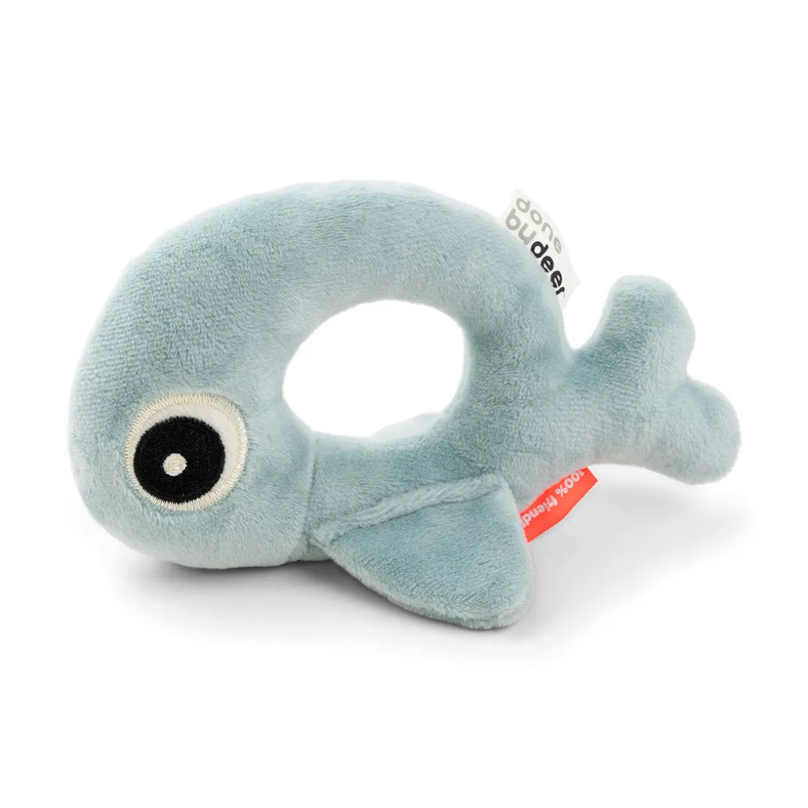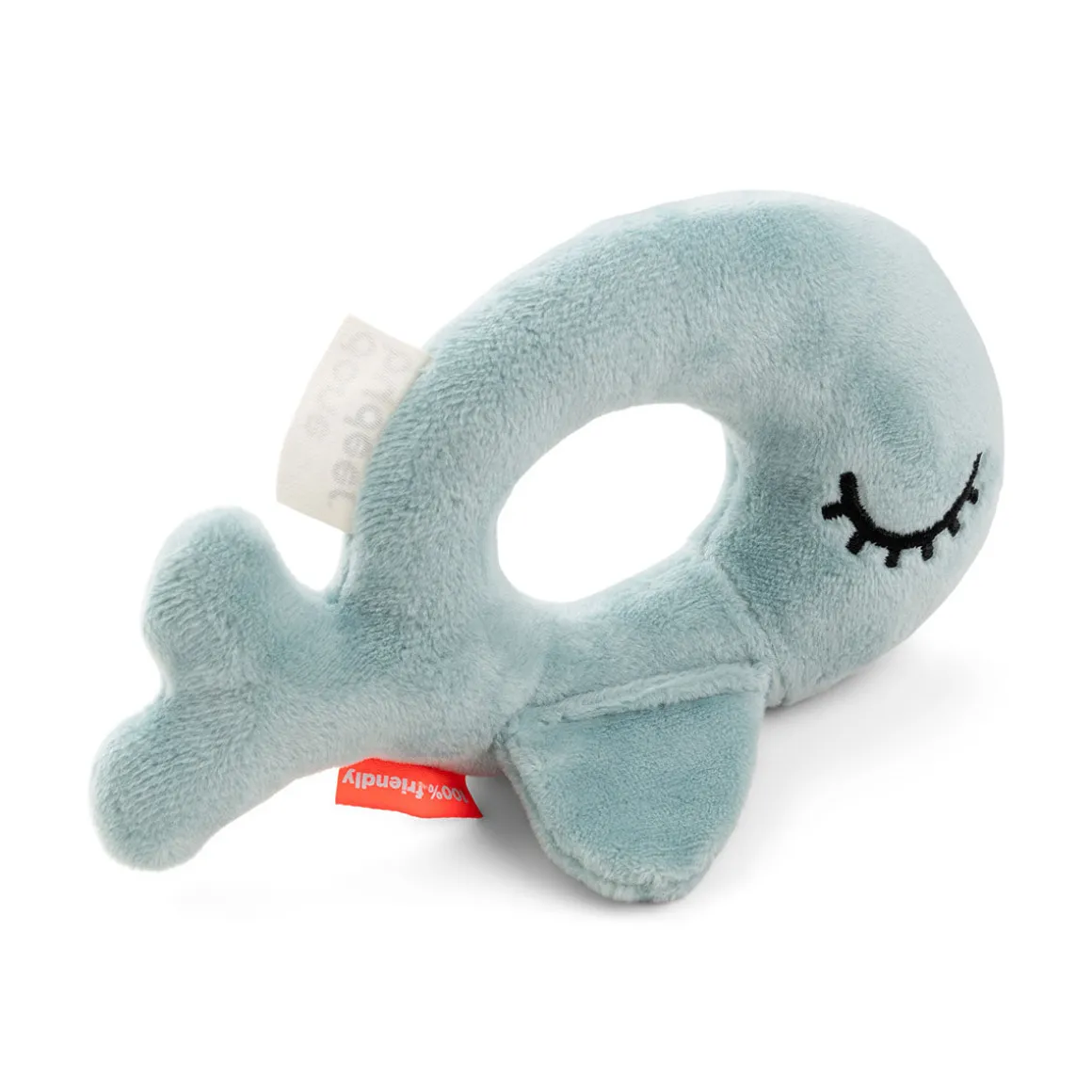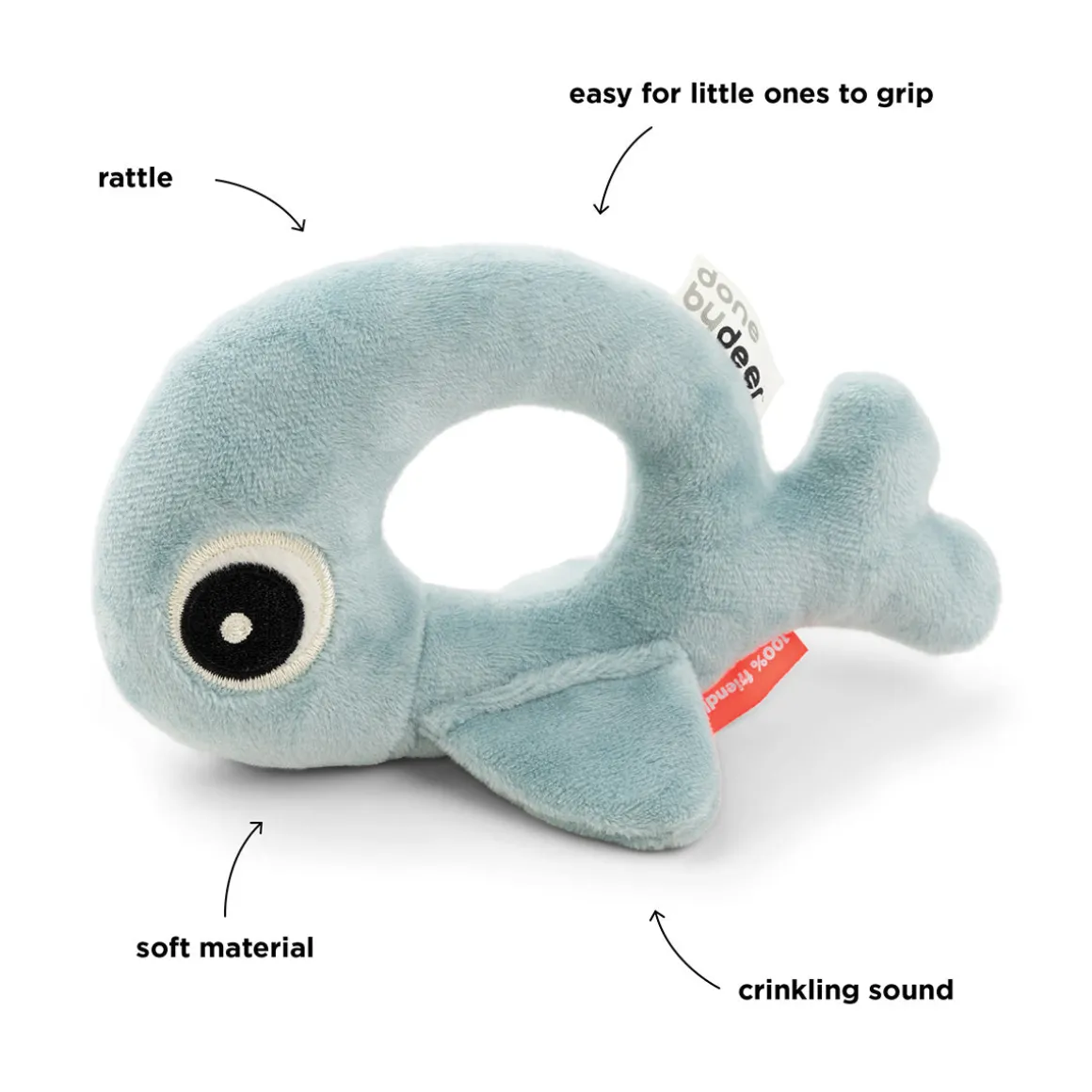 Den bløde Rund rangle giver en sød ranglelyd, når den rystes, og finnerne giver en sjov knitre-lyd, når de berøres. Finnerne gør det muligt for ranglen at stå af sig selv og er velegnet til mavetid.