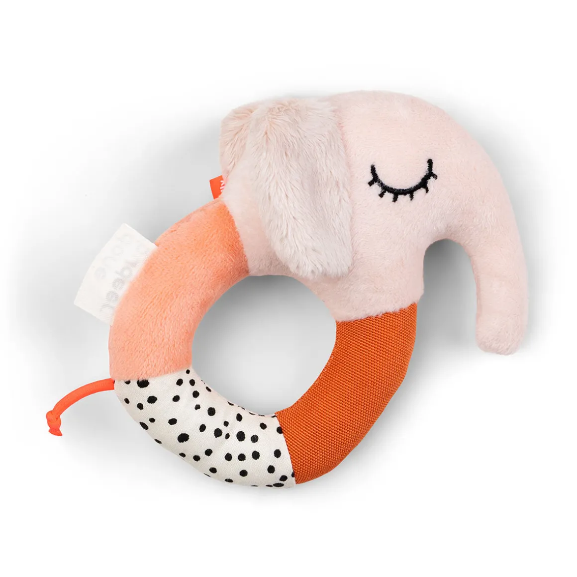 Den bløde Rund rangle har flere elementer, der stimulerer din baby. De mange farver og teksturer gør den sjov at se på og røre ved. Elphee laver en sød ranglelyd, når den bliver rystet, og ørerne har en sjov knitre-lyd.