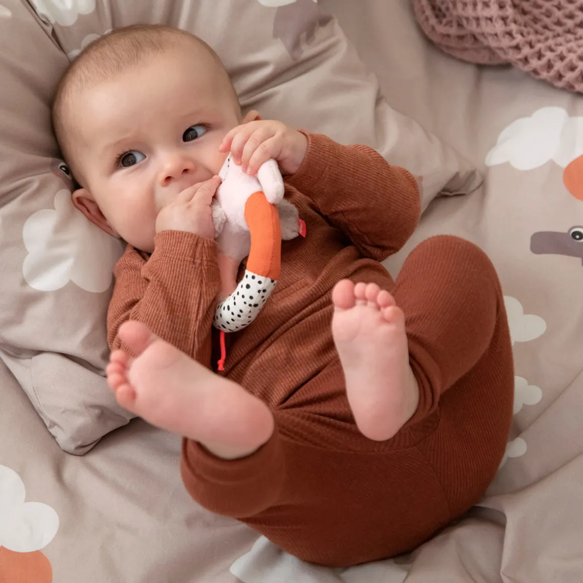 – Rangle med kontrastfarver og knitre-lyde, der underholder og stimulerer din babys sanser