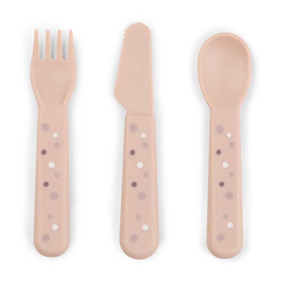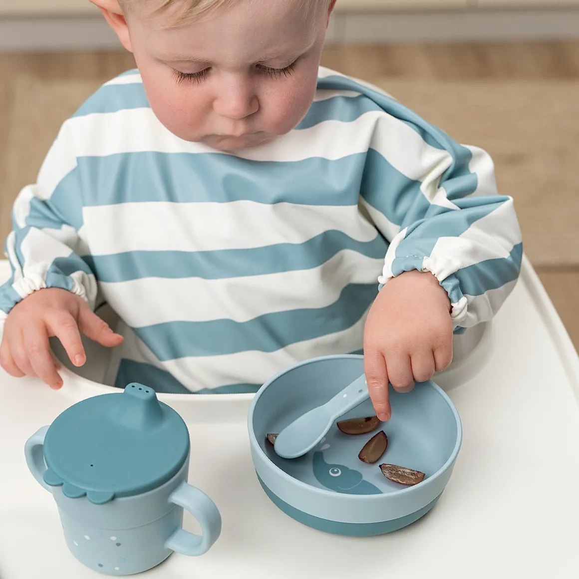 Skålsættet er perfekt til småspisere og indeholder en skål, en kop med tud og et bestiksæt.