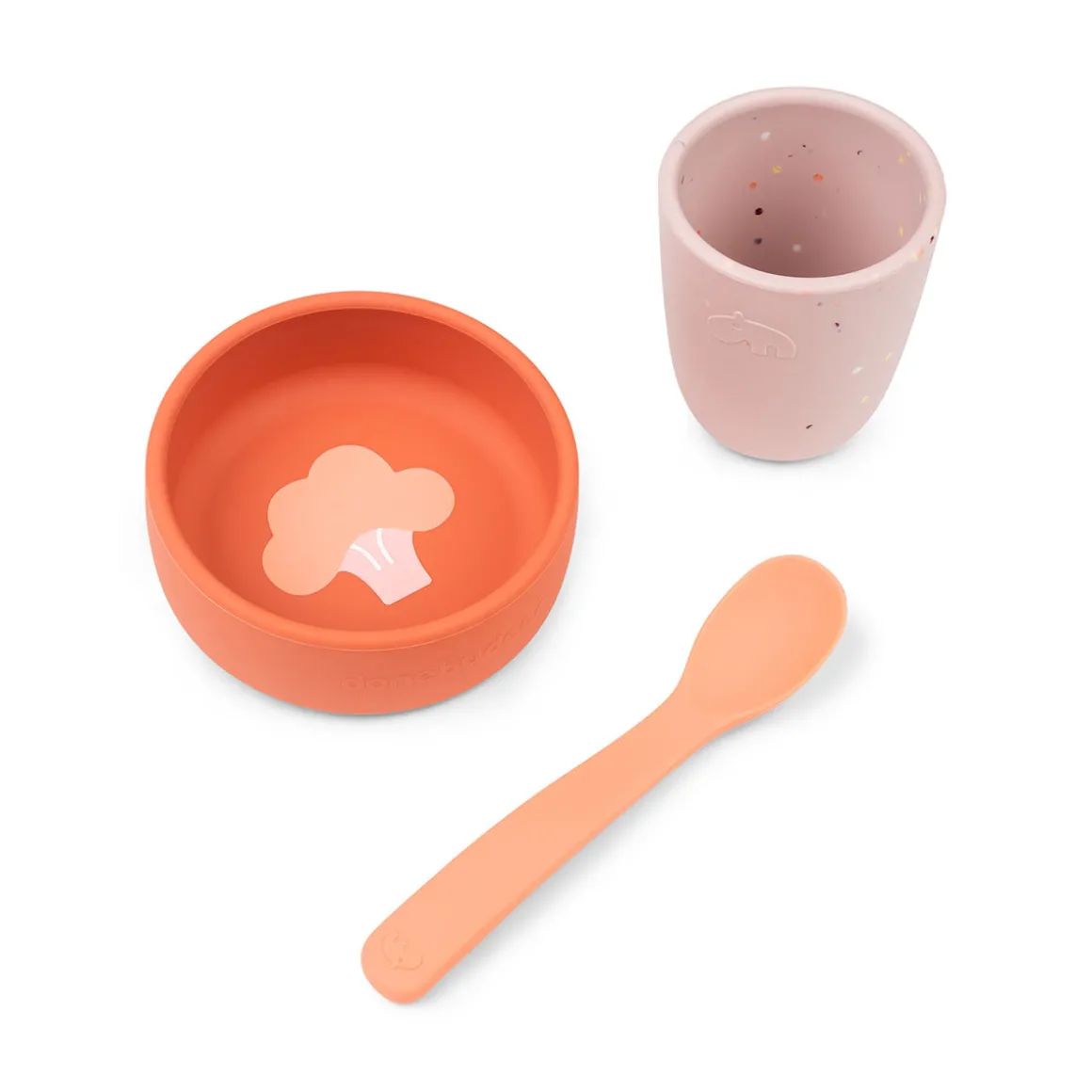 En Papaya/Pudder skål, et pudder confetti krus og en koral ske gør dette spisesæt til en perfekt gaveidé til nye små spisere.