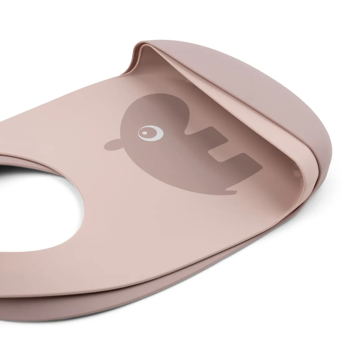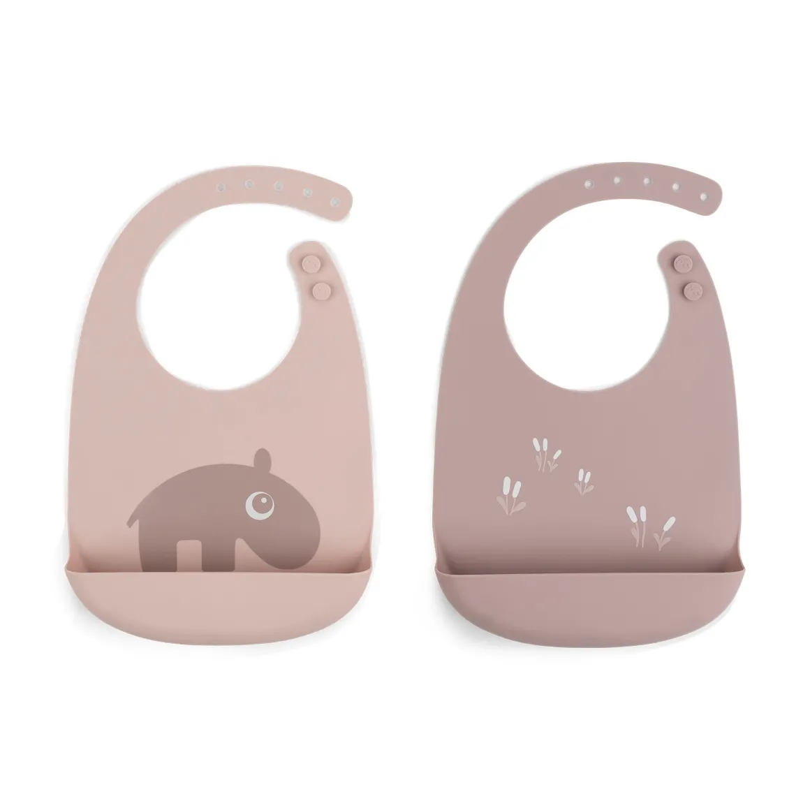 De søde hagesmække i pudder er dekoreret med Deer friend Ozzo og dekorative vandplanter. Silikone hagesmækken er nem at tørre af eller vaske i opvaskemaskinen.