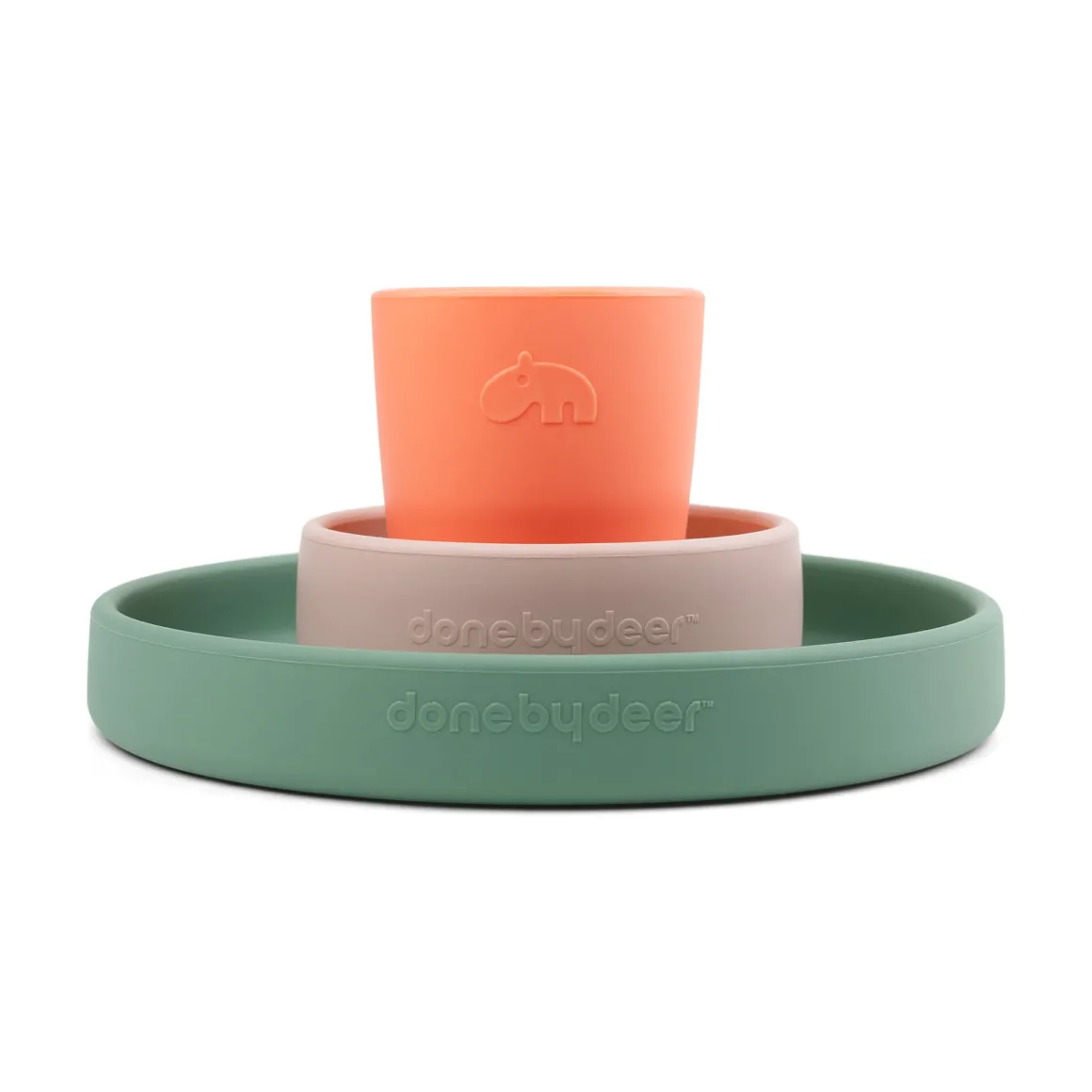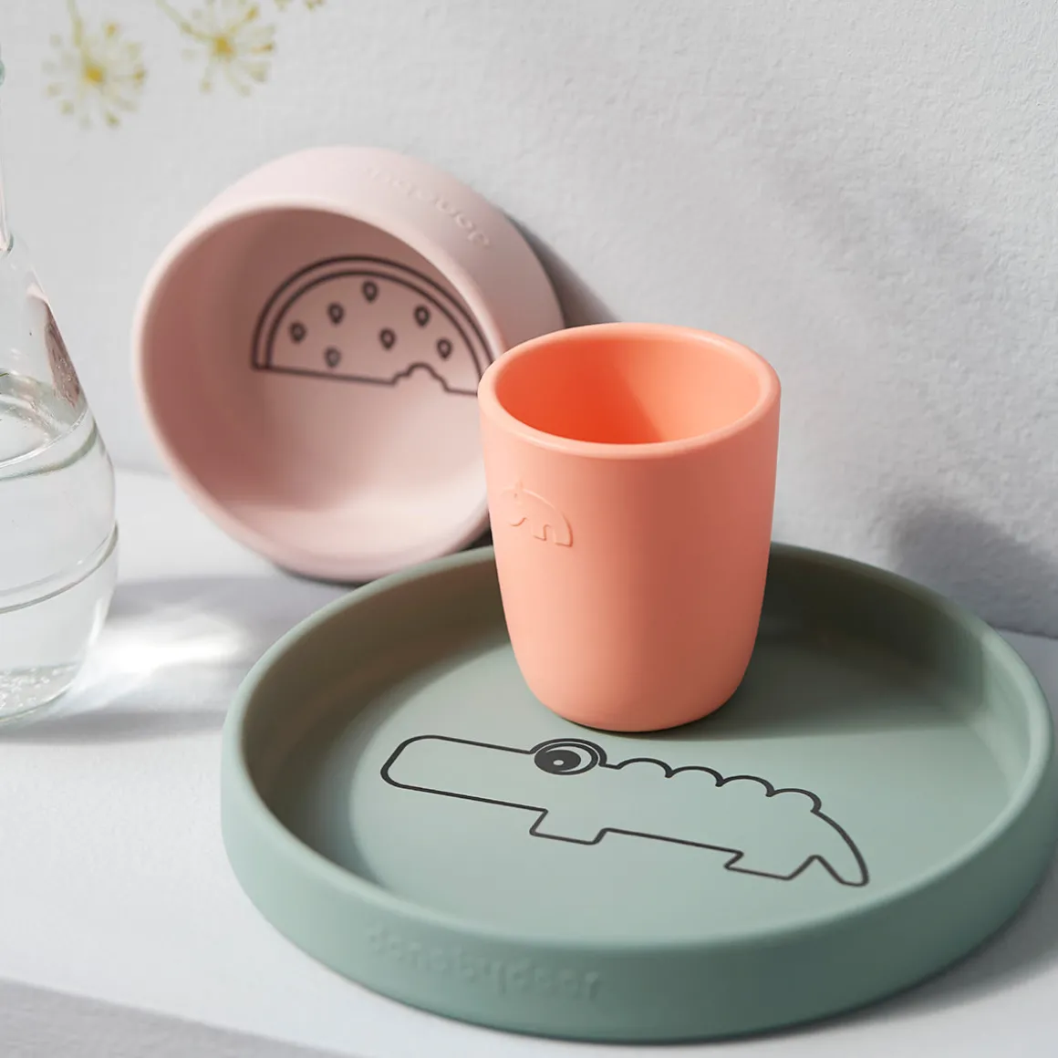 En grøn Pudder/Koral-tallerken, en vandmelon-skål og et frisk koralrødt minikrus gør dette spisesæt til en perfekt gaveidé til småspisere.