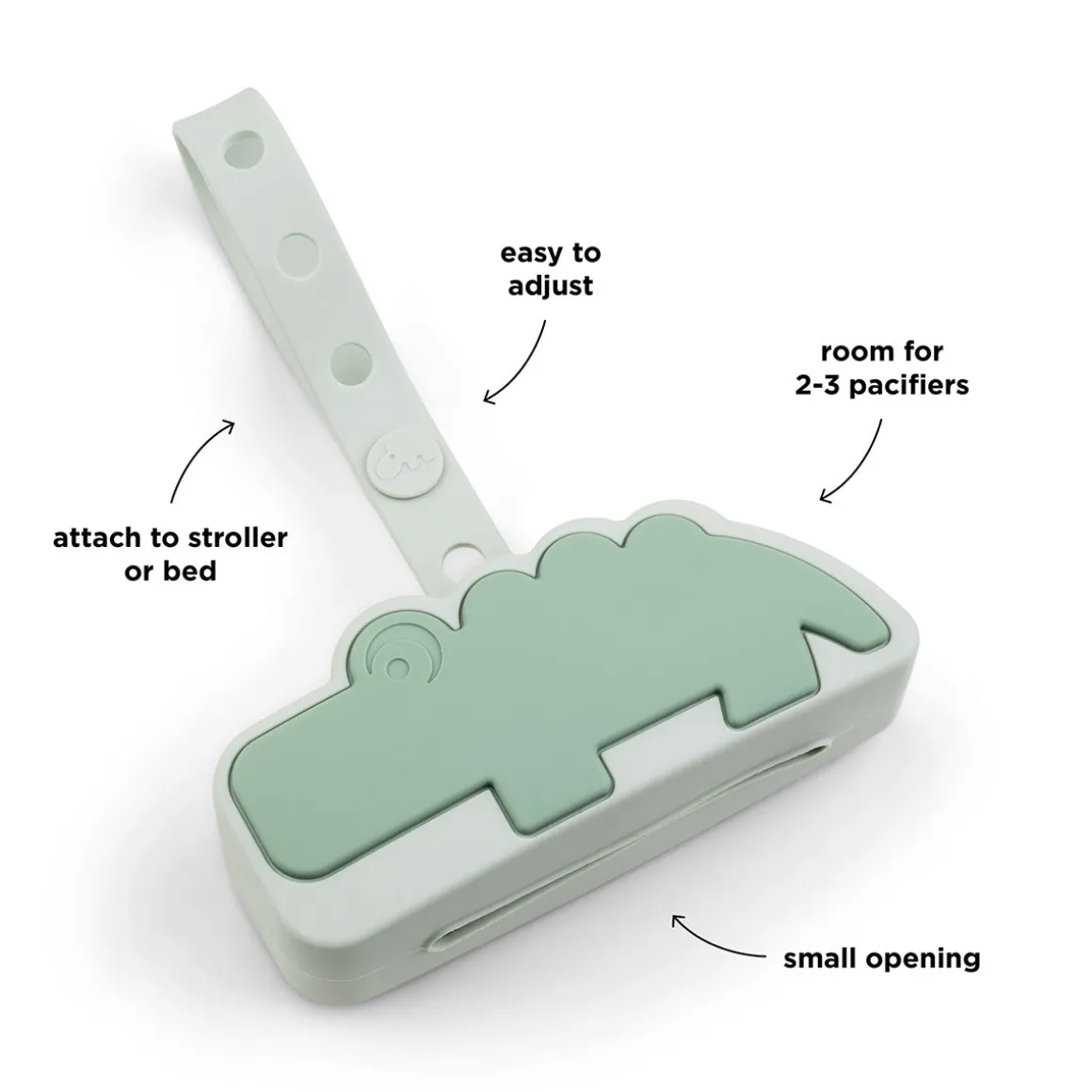 Silikone sutteholderen – Croco – Grøn er lavet af blød silikone med plads til 2-3 sutter. Med en justerbar strop, så den nemt kan sættes fast på barnevognen eller pusletasken, sikrer denne pose, at dit barns sutter forbliver rene, er tilgængelige og nemme at finde.