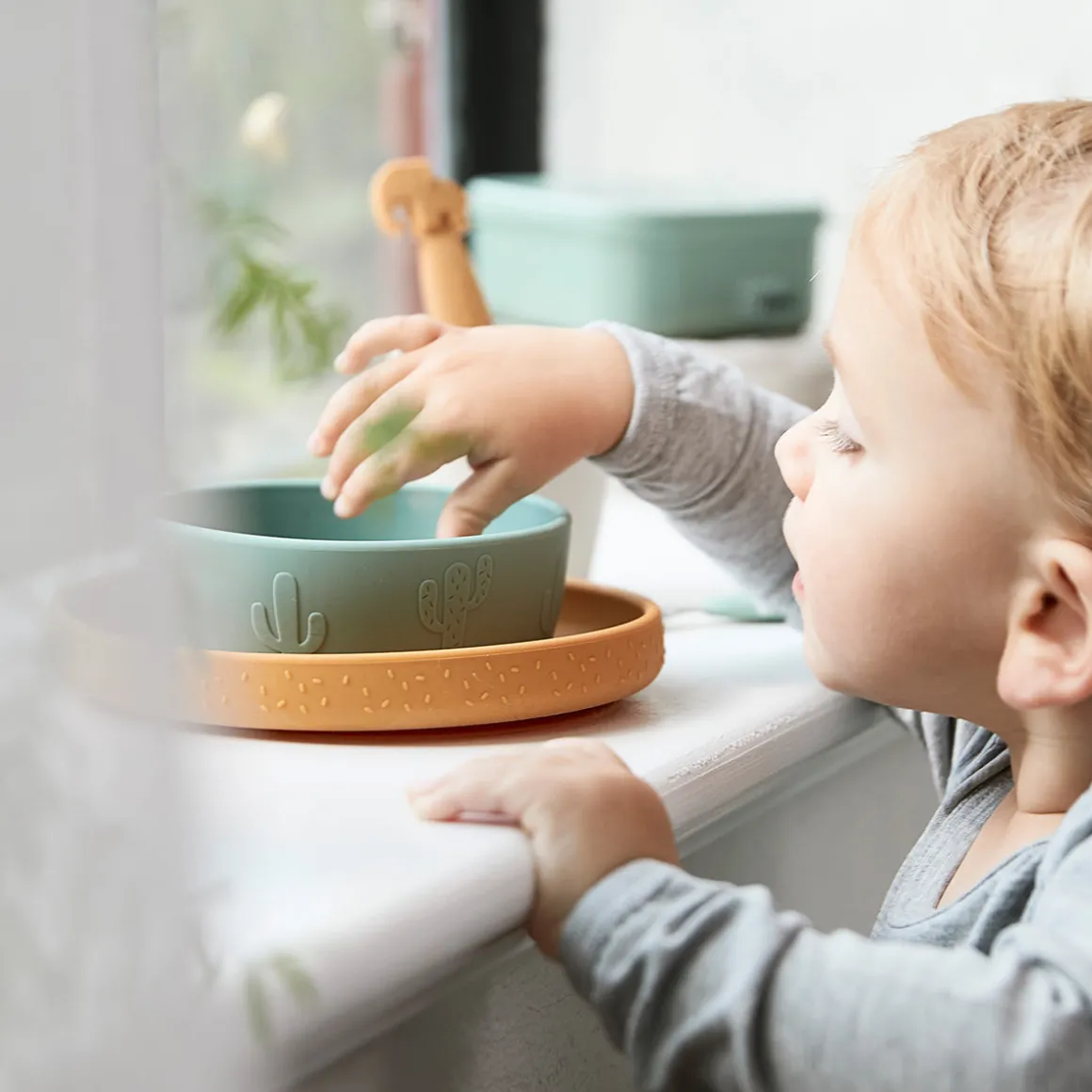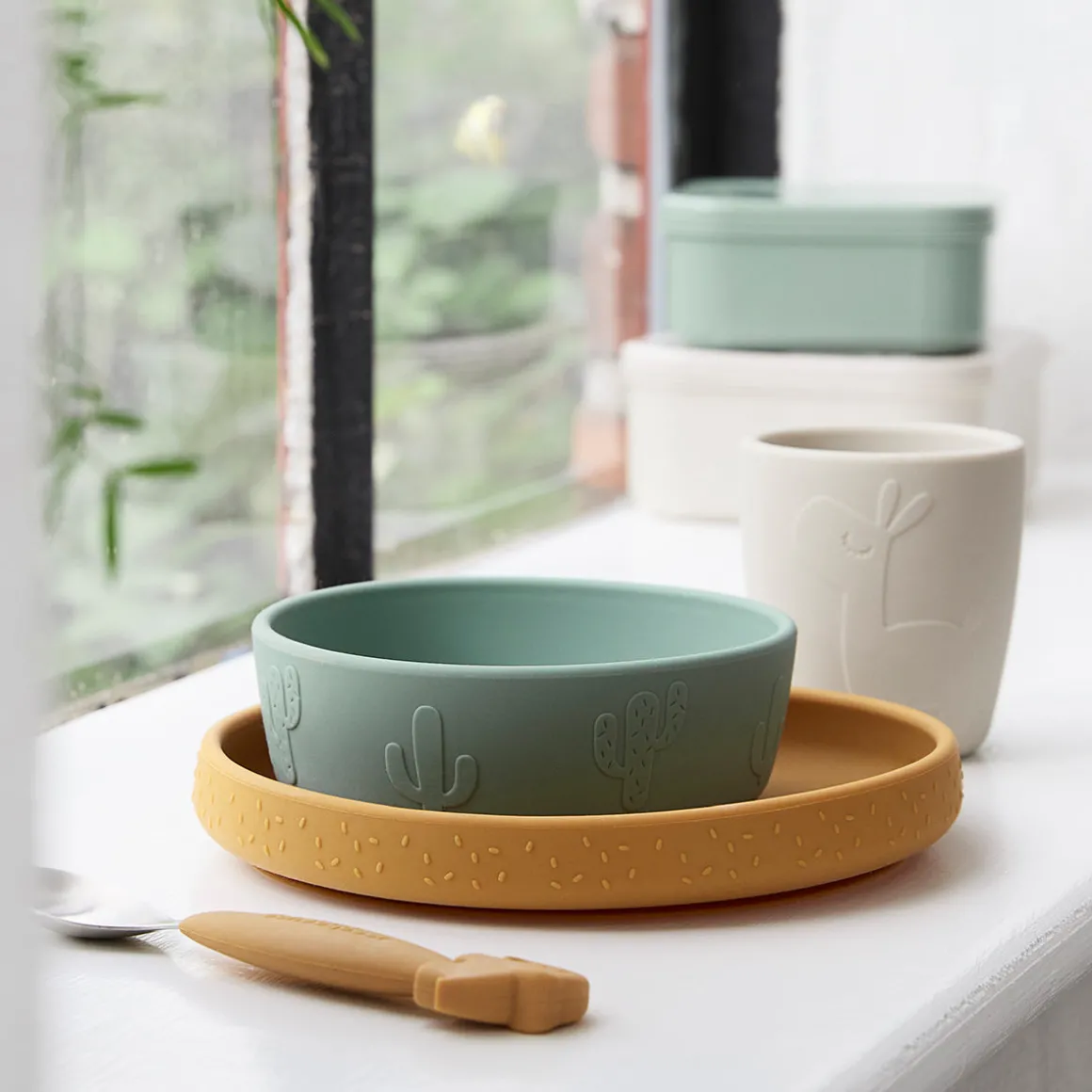 Dæk et sjovt bord med Silikone Stick&Stay spisesæt og Lalee som en cool ledsager. Tallerkenen med sennep, den grønne skål og minikruset med sand er dekoreret med prægede mønstre med Lalee, Birdee, festlig confetti og kriblende kaktusser.