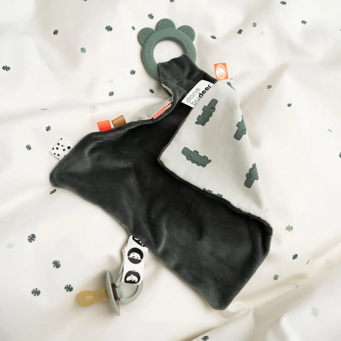 Den søde bidering i silikone med krokodilleskæl og forskellige strukturer, der stimulerer og beroliger kløende gummer, kan tages af og bruges alene. Der er en praktisk velcrolukning og en elastisk løkke til at fastgøre en sut, som man kan have lige ved hånden.