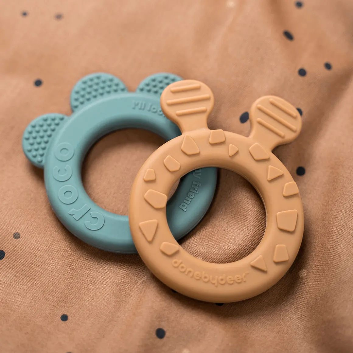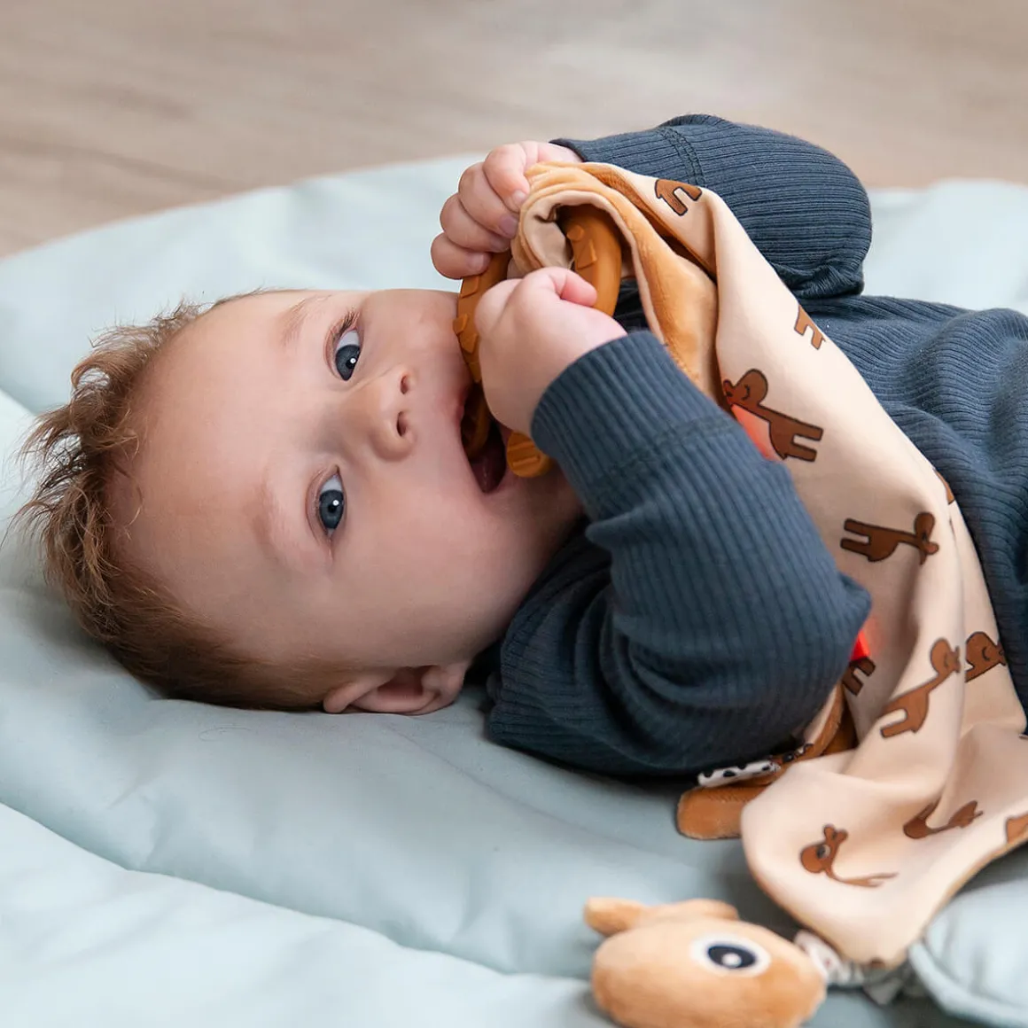 Den søde bidering i silikone med girafører og forskellige strukturer, der stimulerer og beroliger kløende gummer, kan tages af og bruges alene. Der er en praktisk velcrolukning og en elastisk løkke til at fastgøre en sut, som man kan have lige ved hånden.