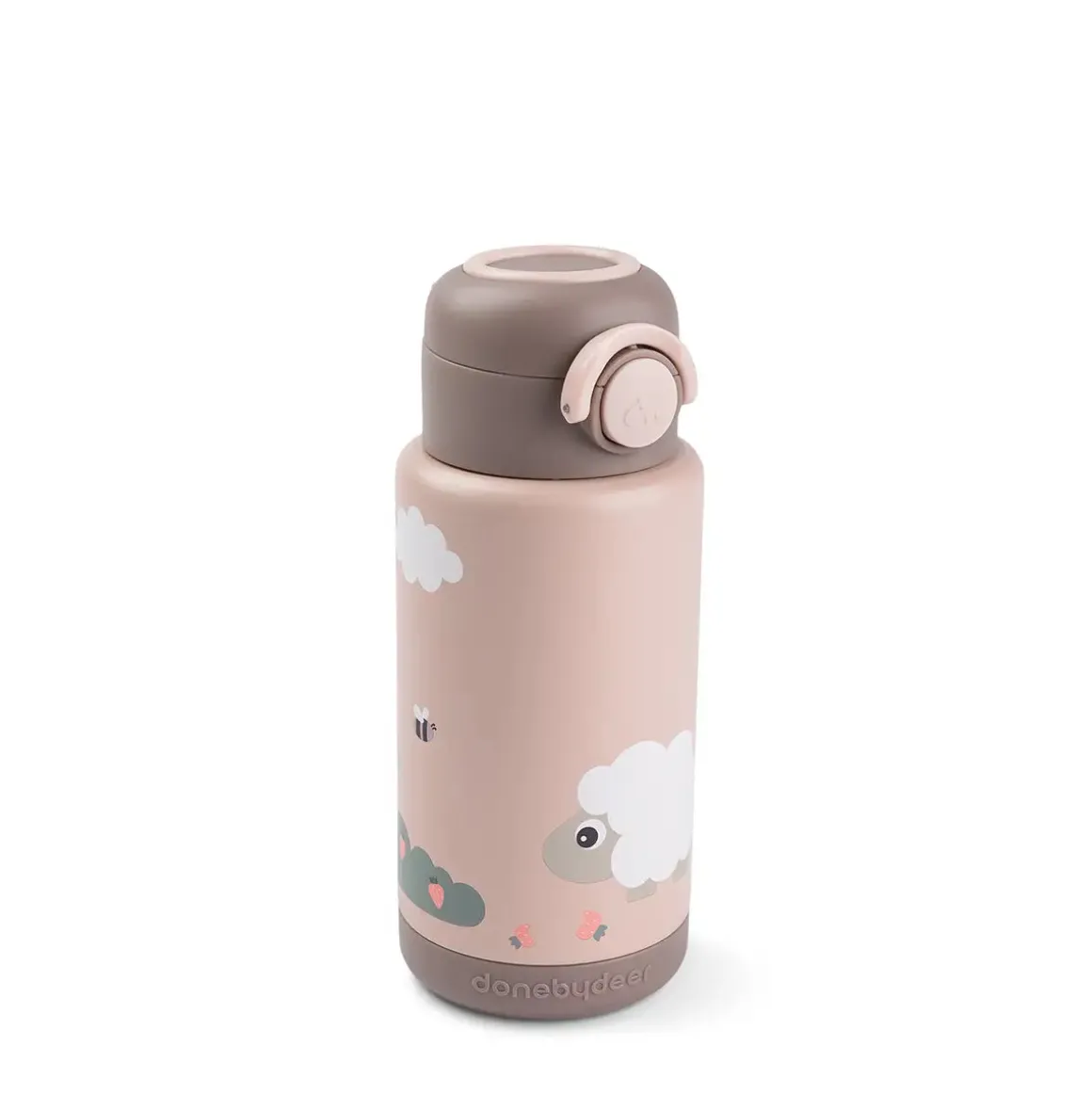 Flasken er i en blød pudderfarve og bliver ekstra sød af den kække Pigee og den hyggelige Sheepy, som bringer fnis og hyggeligt selskab til hver drikkepause.