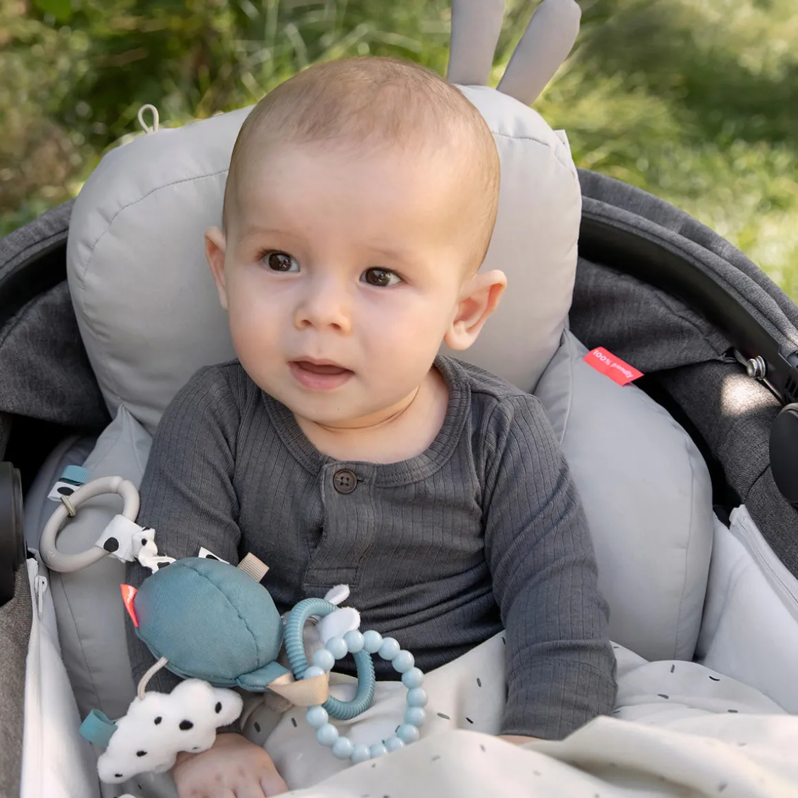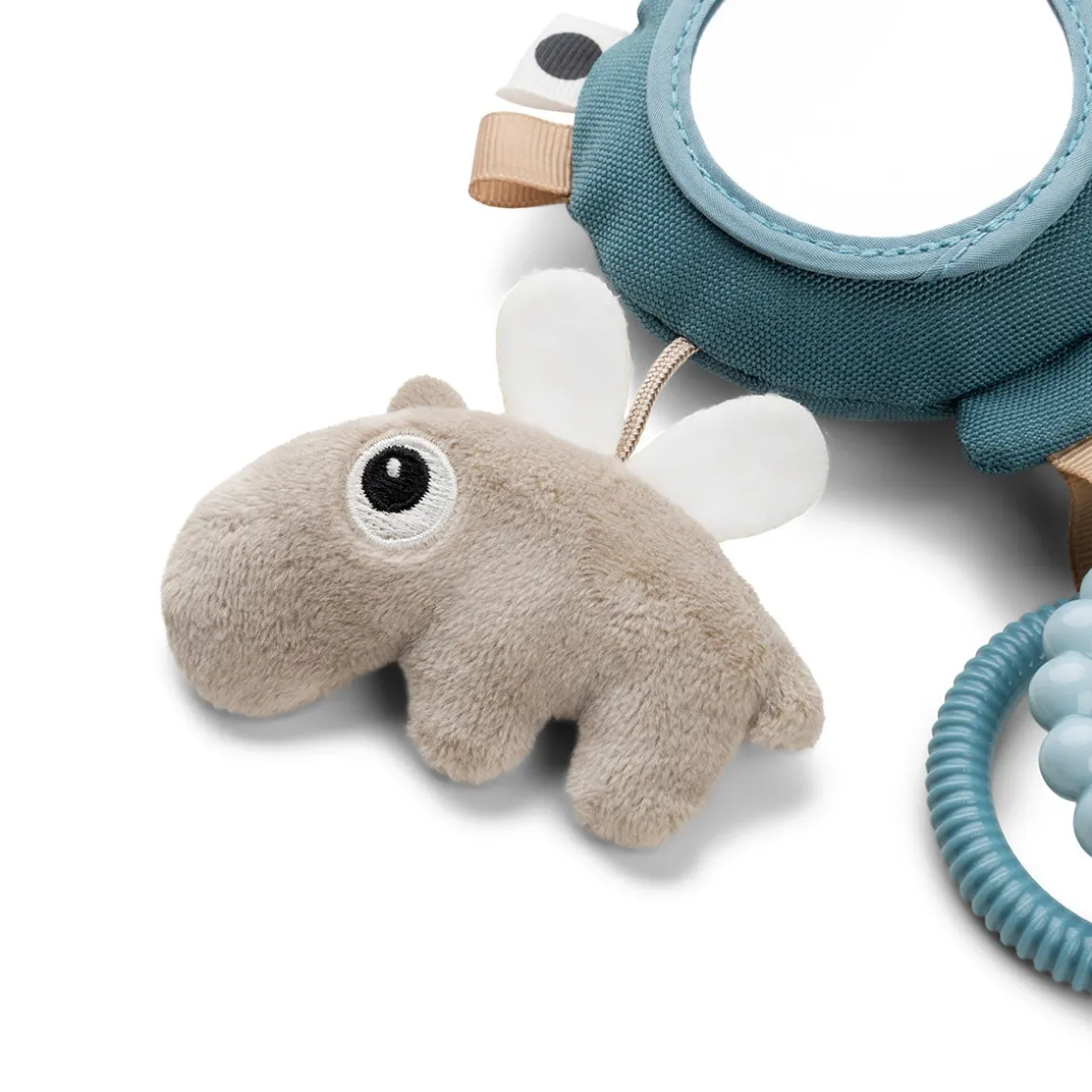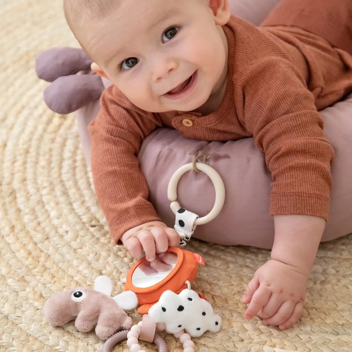 Aktivitetsspejlet har en ballonrangle, en blød tekstureret Ozzo og sky, to teksturerede ringe og sjove tags. Barnet kan nemt gribe fat i ringene og holde aktivitetsspejlet. Brug Ophængsringen til at fastgøre det til barnevognen, autostolen eller mavepuden.