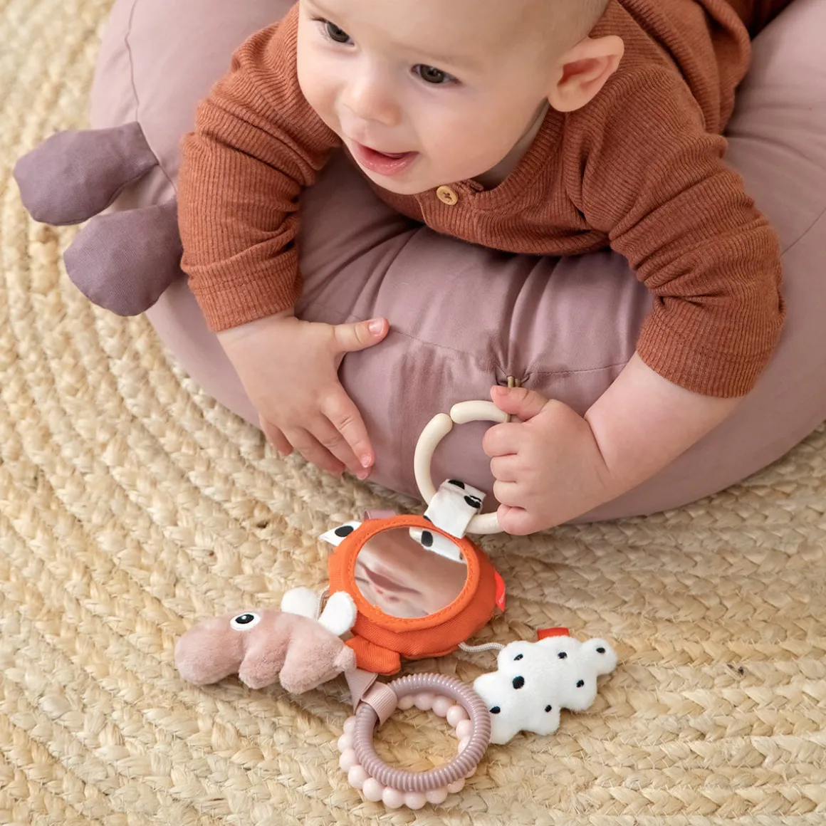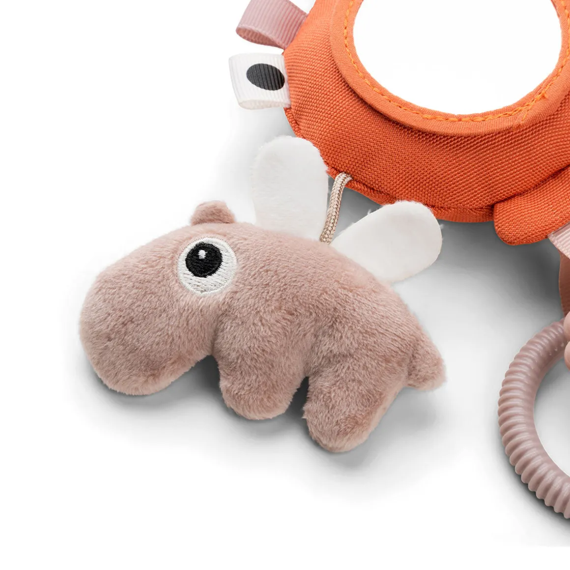 Aktivitetsspejlet har en ballonrangle, en blød tekstureret Ozzo og sky, to teksturerede ringe og sjove tags. Barnet kan nemt gribe fat i ringene og holde aktivitetsspejlet. Brug Ophængsringen til at fastgøre det til barnevognen, autostolen eller mavepuden.