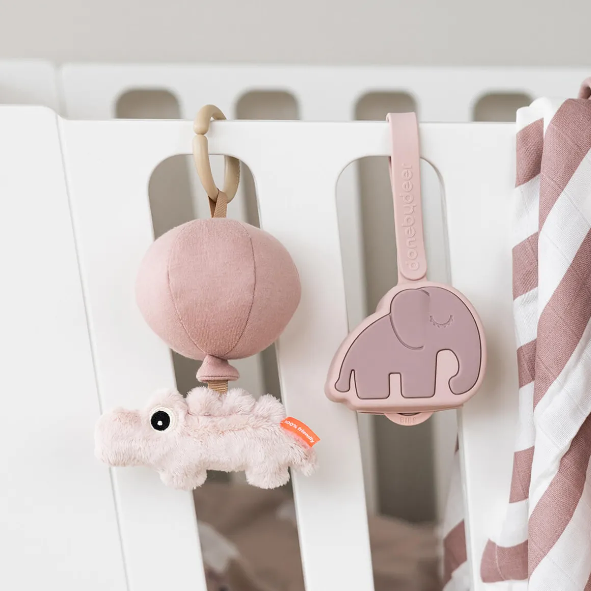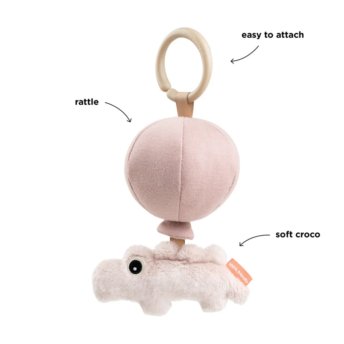Nyd sjov på farten med Deer friend Croco, din perfekte rejsekammerat. Croco svæver under en sød pudderfarvet ballon og bringer glæde med en herlig lyd af rangler. Den kan nemt sættes på barnevognen, klapvognen eller aktivitetscentret og sikrer sød underholdning, uanset hvor du går.